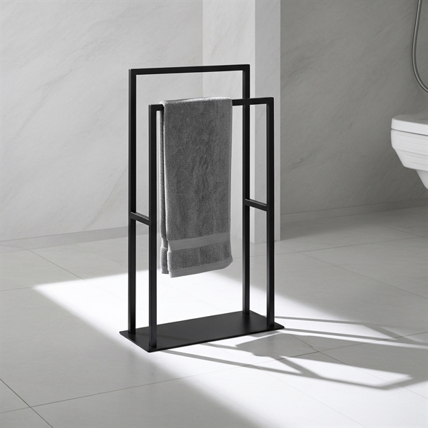 Fritstående håndklædeholder i sort - RivaltanaHåndklædeholder i sortSort Håndklædeholder til badeværelset i metal.Simpel, klassisk og stilren håndklædeholder med plads til i alt 2 håndklæder.Sort håndklædeholder