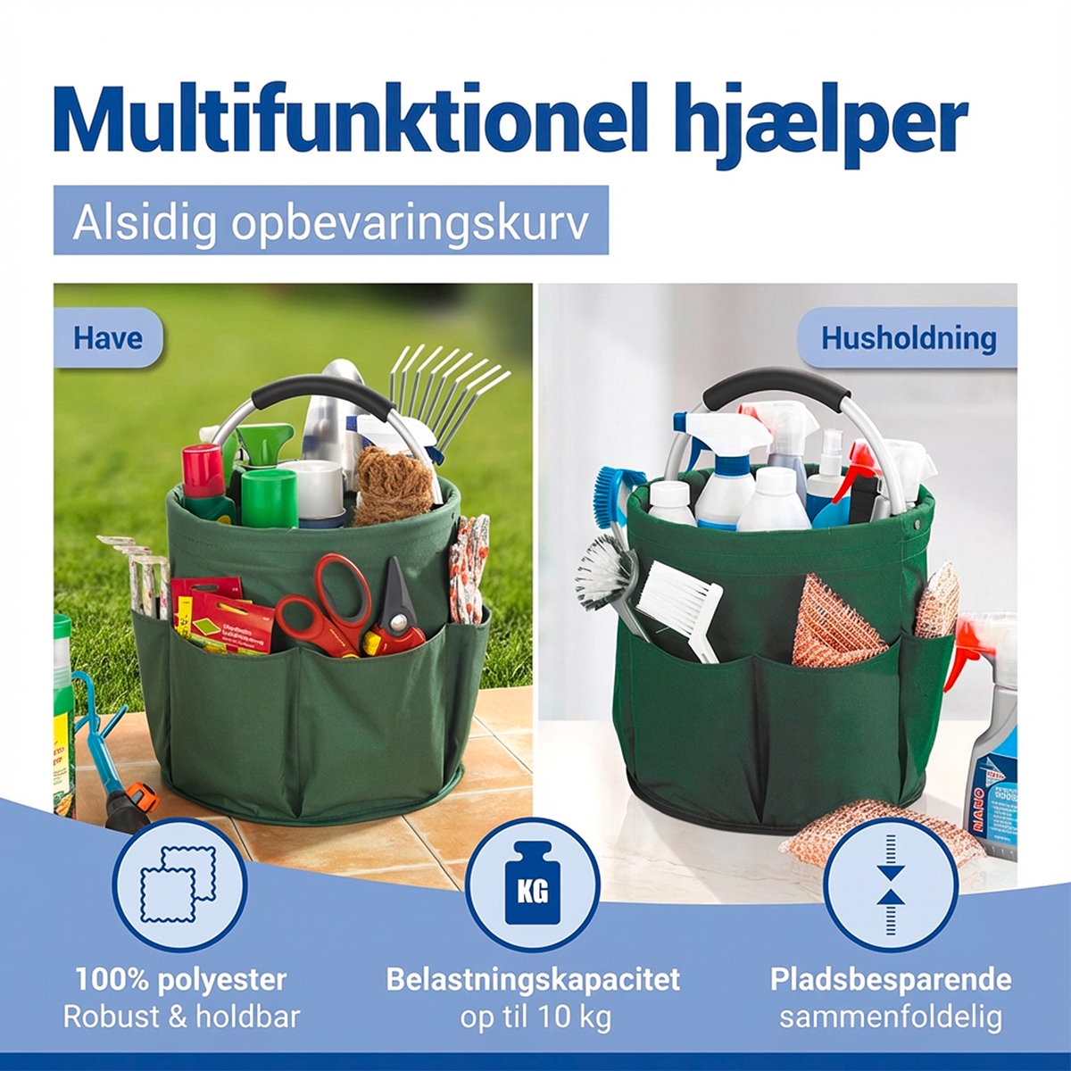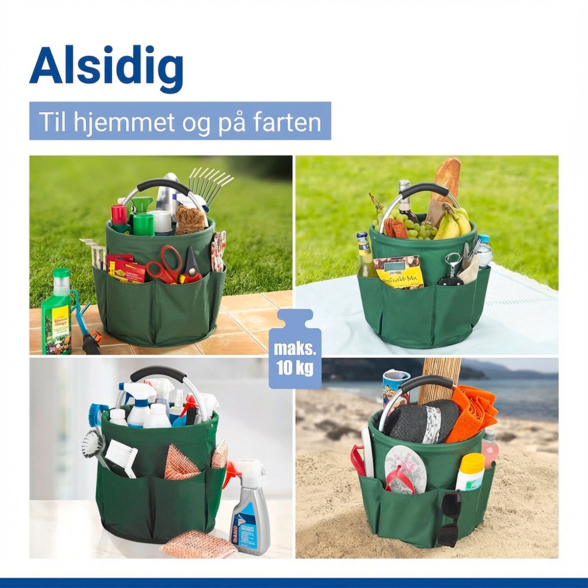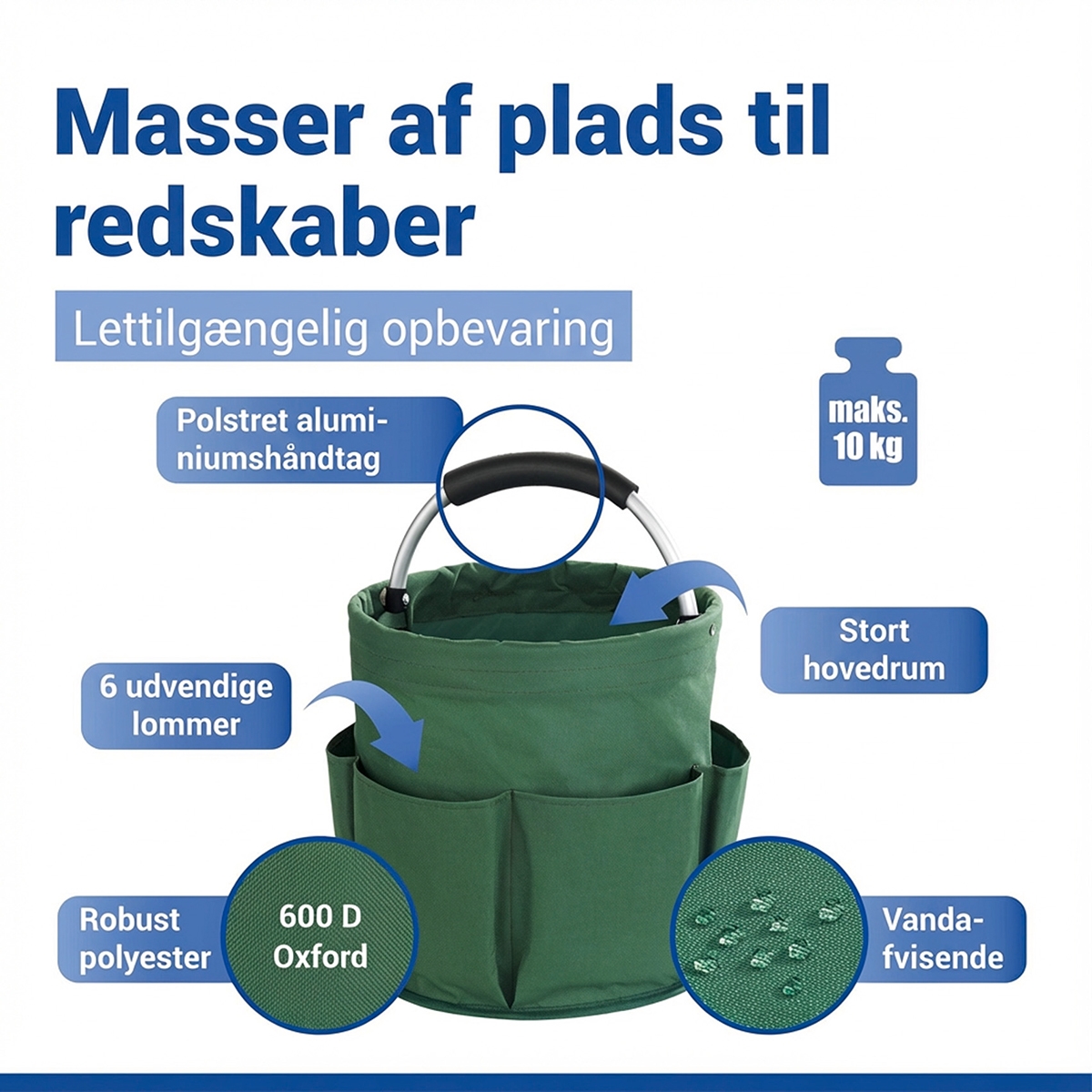 Hav nemt alle dine små havereskaber med rundt når du går.i haven. Det store rum i midten kan bruge til haveaffald når du luger, eller du kan have frø og løg ved hånden når du sår. De mange lommer er velegnede til små havereskaber som skovle, sakser og små river.