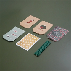 Pakken indeholder 24 papirsposer i forskellige designs med tilhørende klistermærker nr. 1-24, og 24 små grønne klemmer i træ.