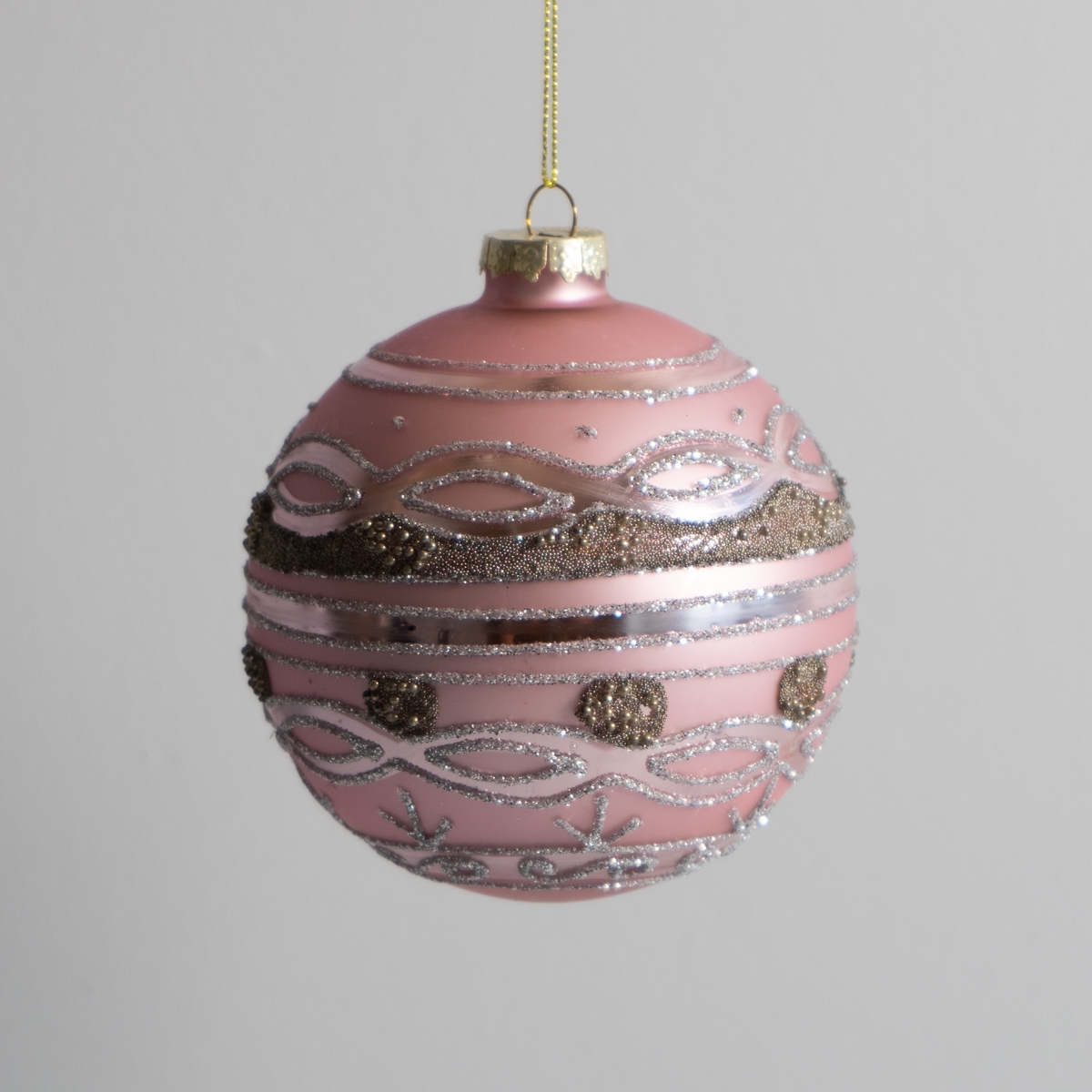 Glaskugle i en rosa/lyserød nuance med glimmer og sirlige små detaljer.