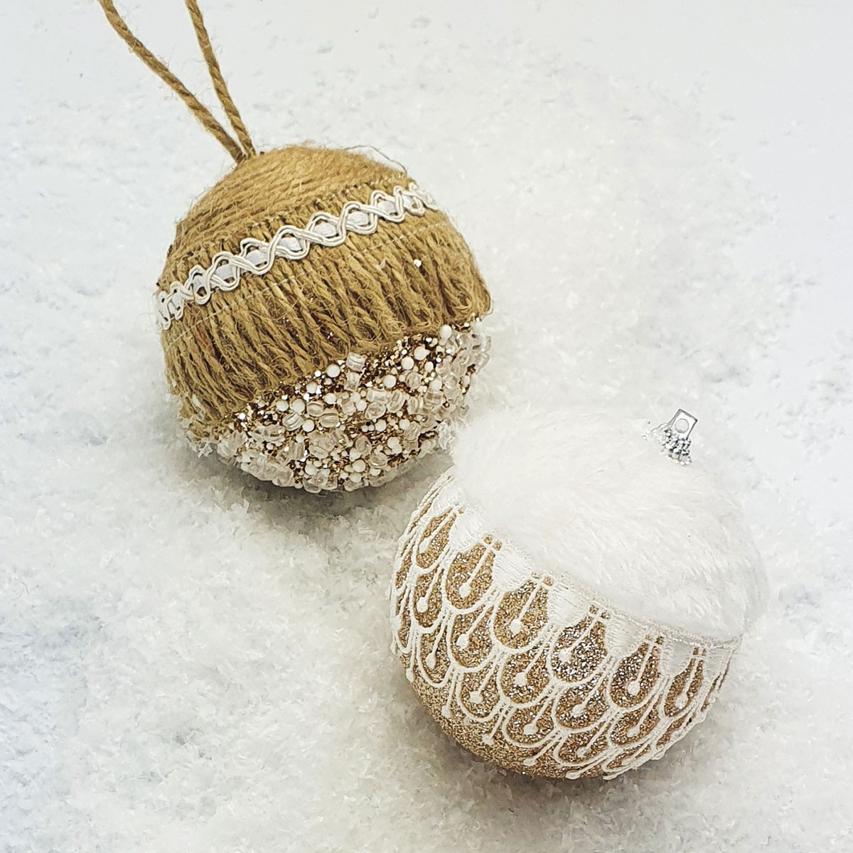 Pakke med 6 stk. beige farvede julekugler.Julekugler lavet i flamingo, beklædt med glimmer, palietter, snor og stof