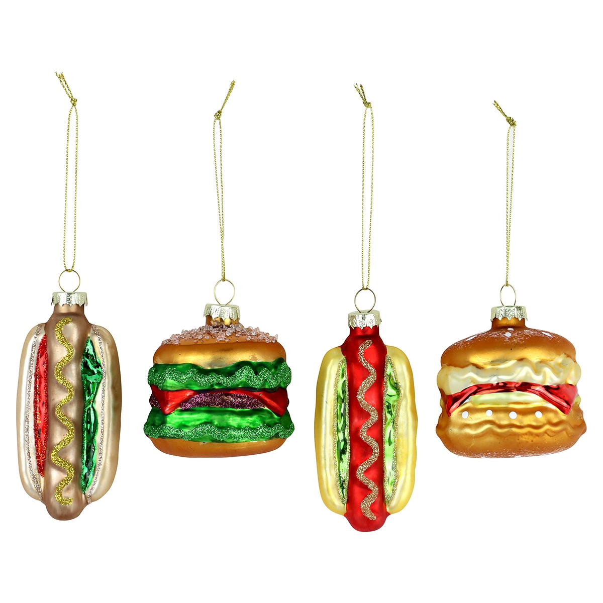 Pynt juletræet i hjemmet med nøje udvalgt julepynt. Her en sjov og anderledes pakke med 2 forskellige burgere og 2 hotdogs.