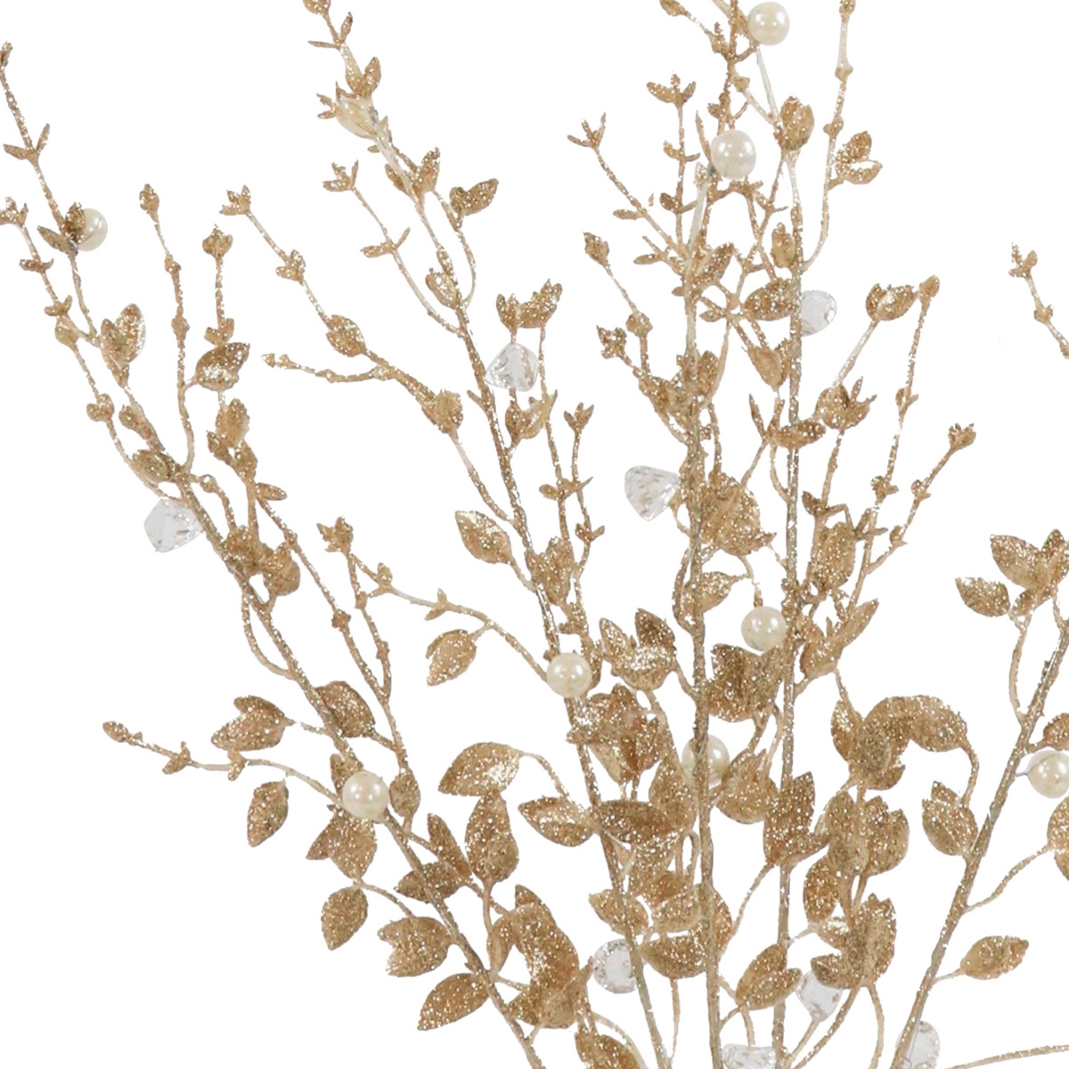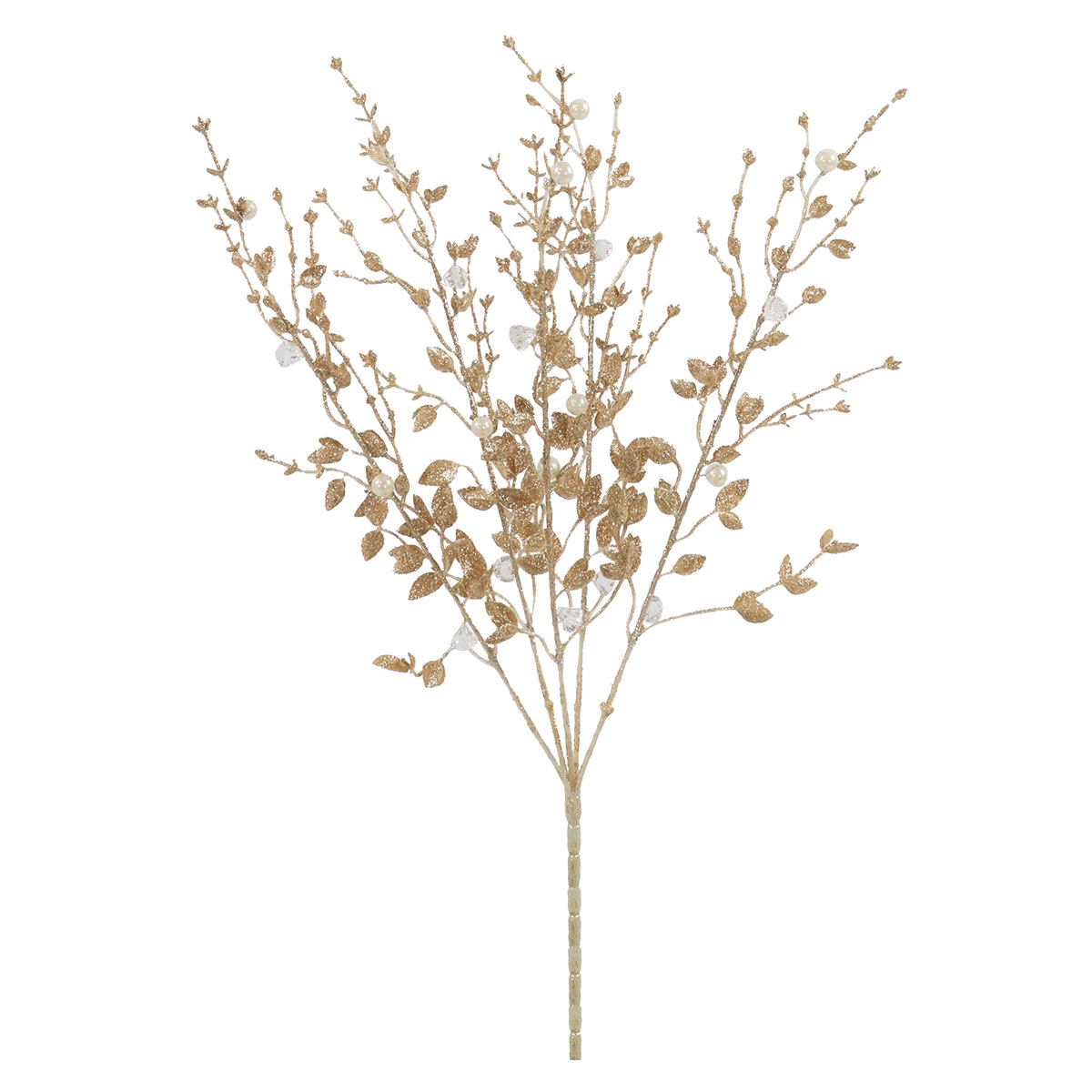 Fineste kunstige gren i en flot champagne farve, fyldt med glimmer og smukke perler. Lavet af plast og metal.