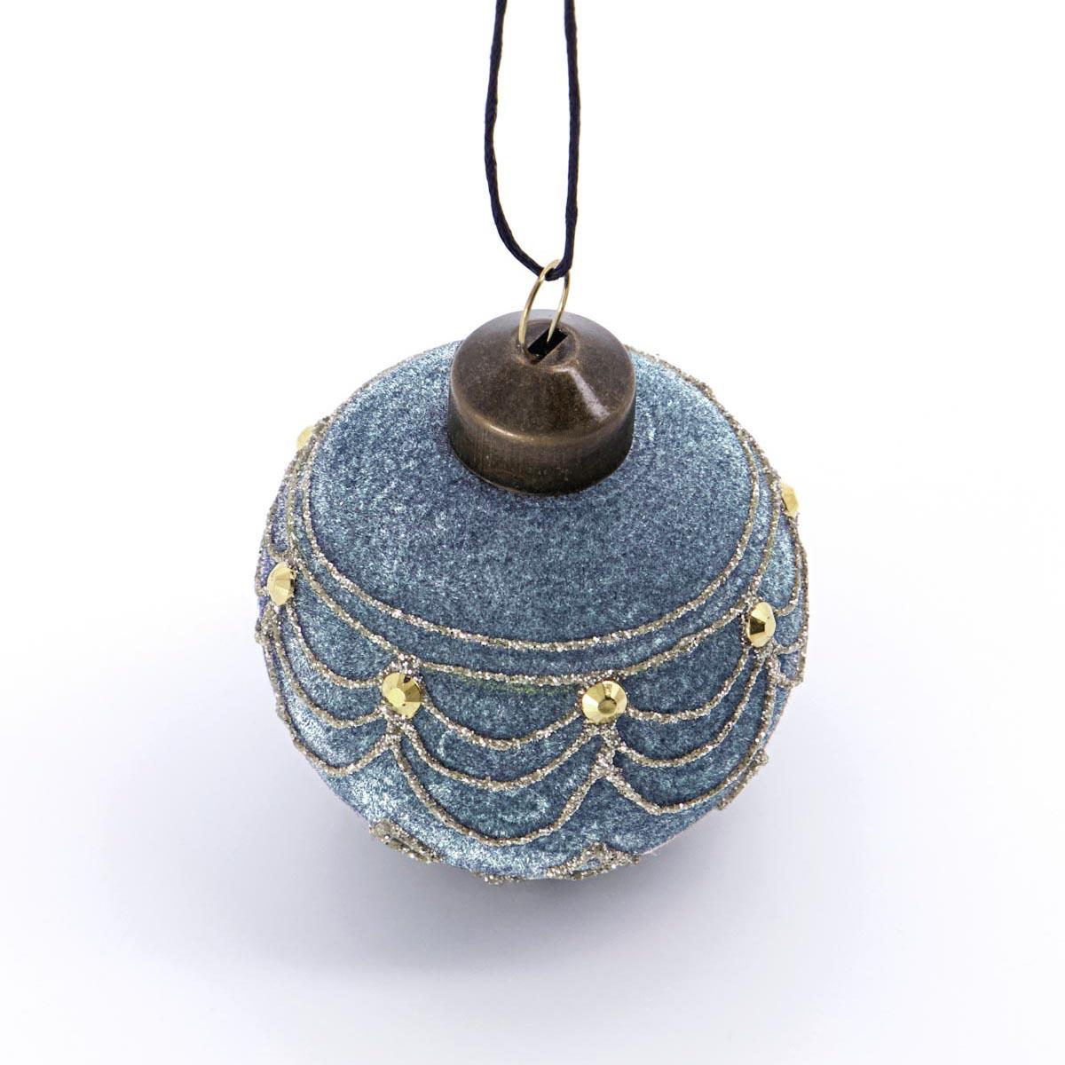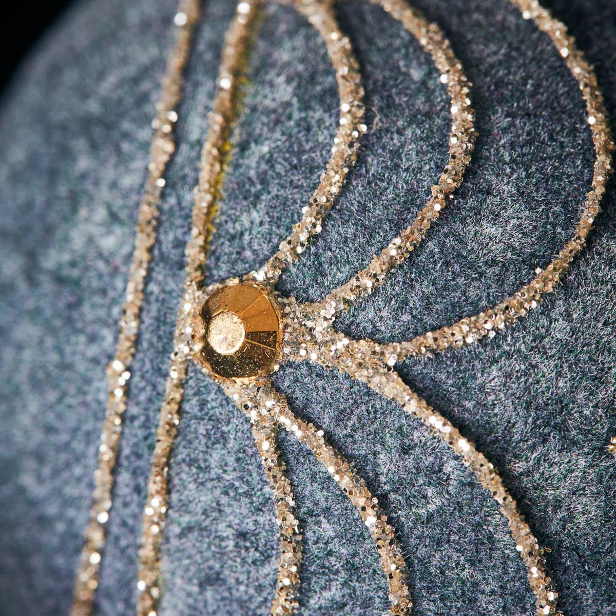 En glaskugle beklædt med lækkert blødt plys og pyntet i et smukt mønster med glimmer.