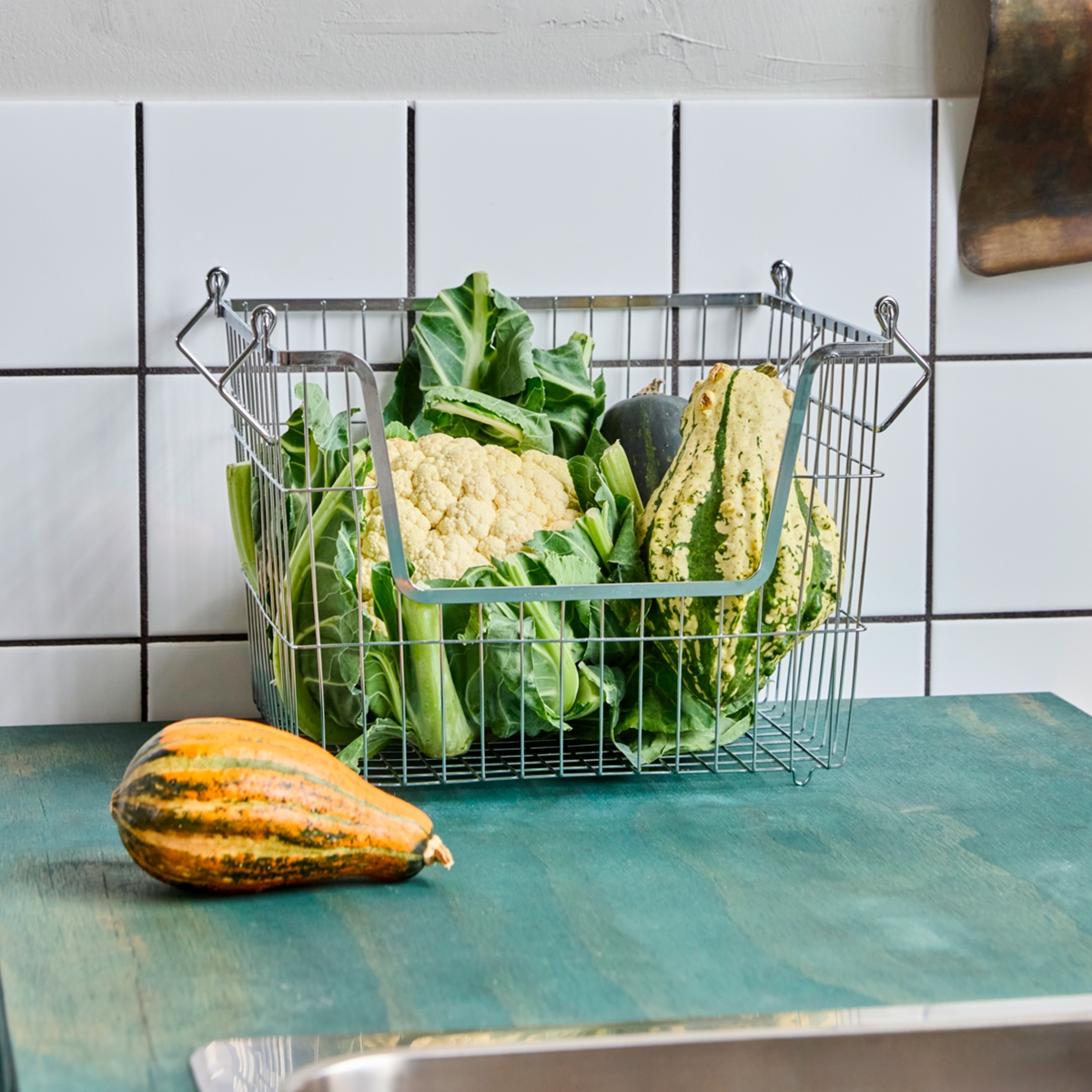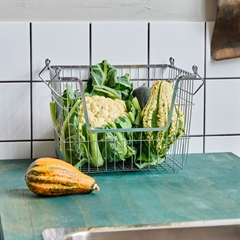 Håndtagene på trådkurven kan vippes ind i kurven og du kan herefter stable kurvene og samtidig have noget heri.
