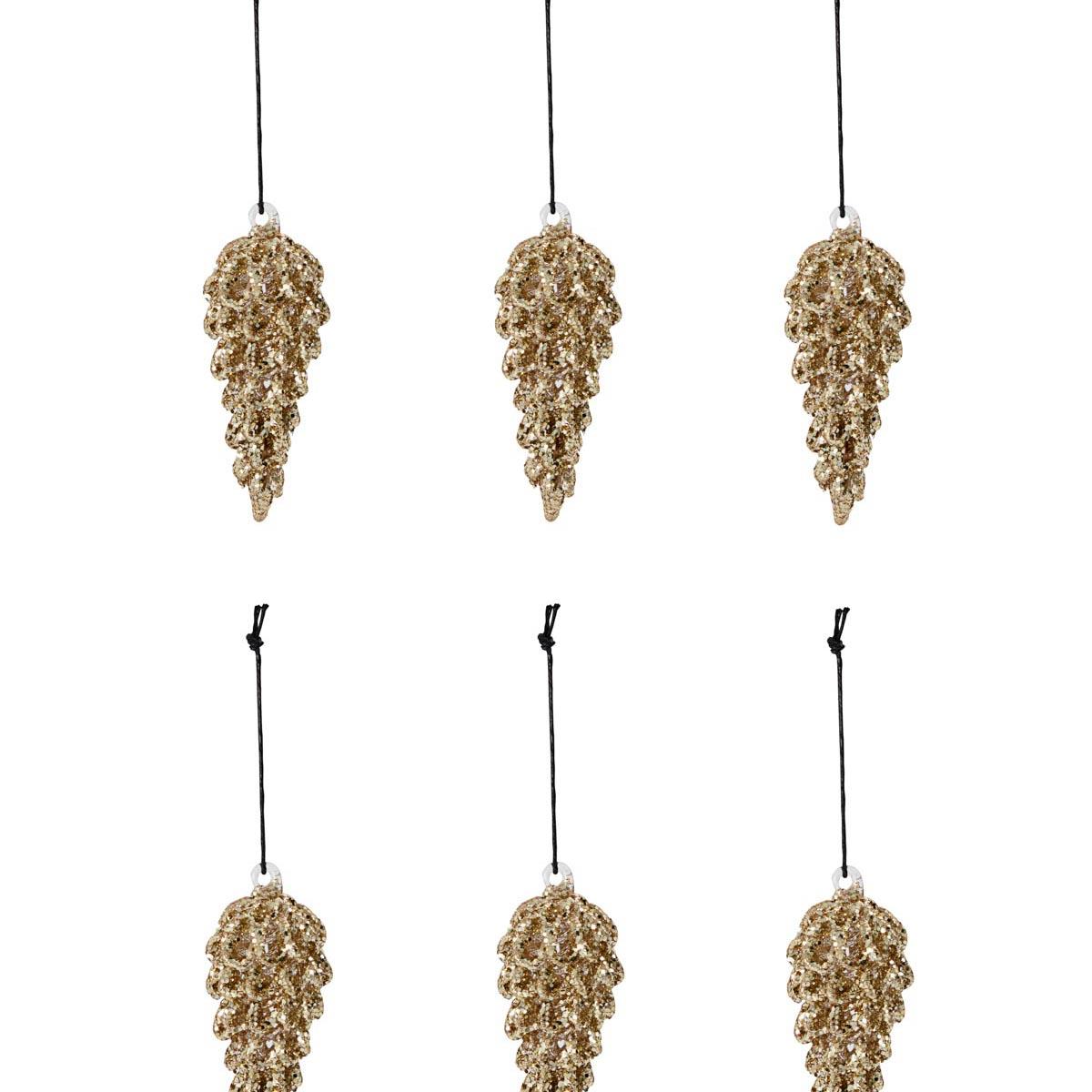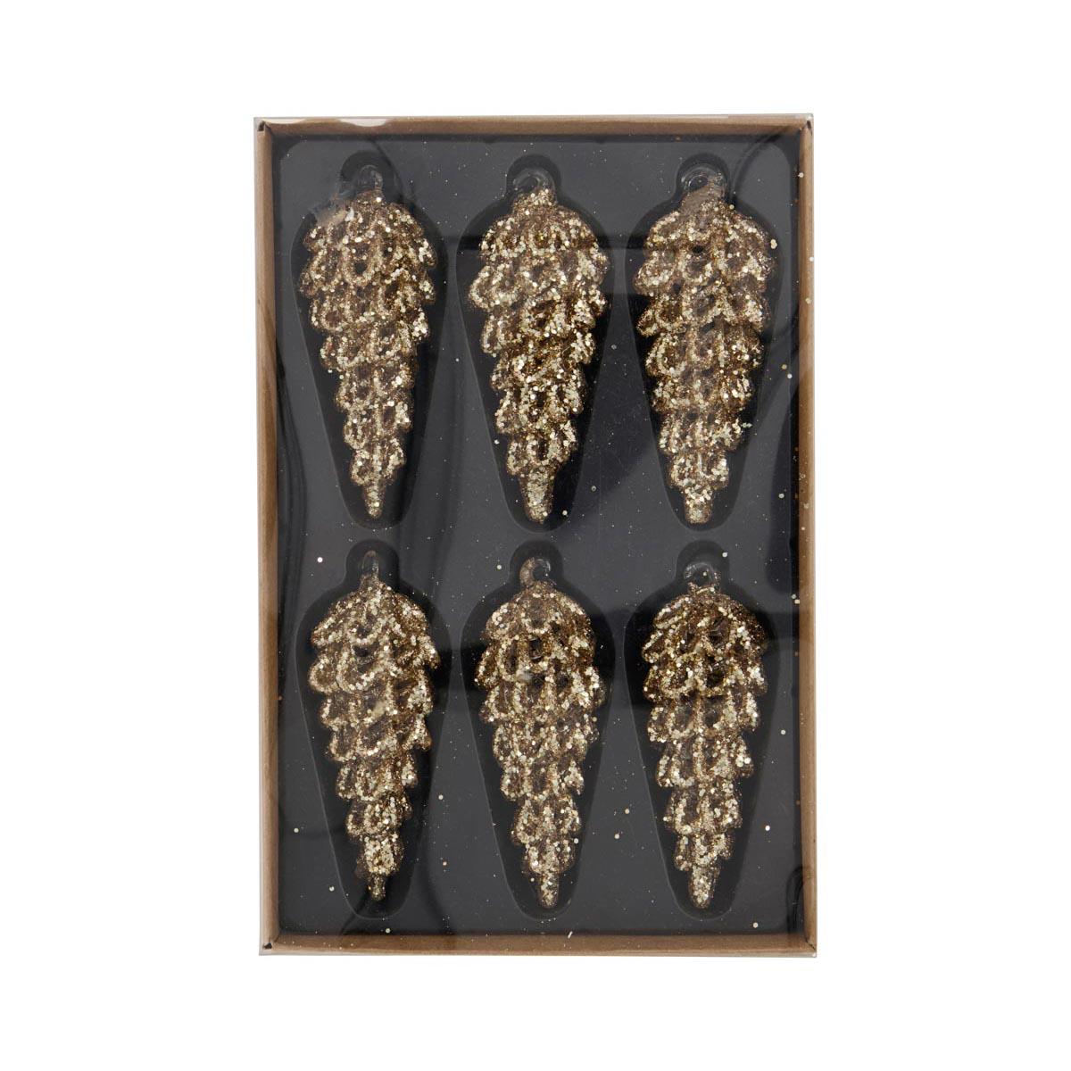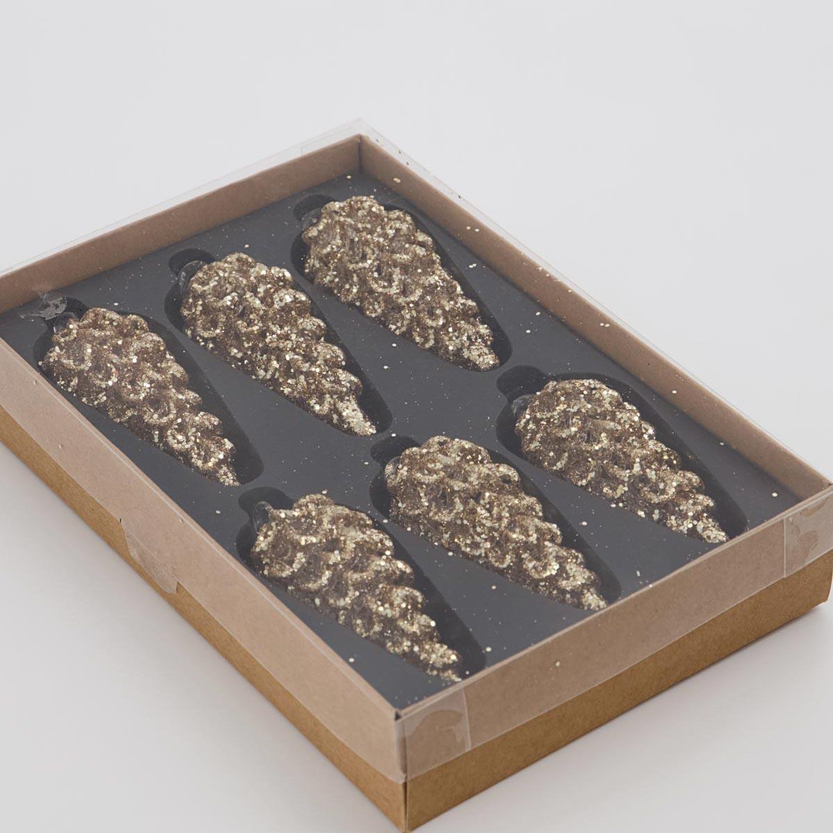 Der er 6 kogler i en pakke. Lavet i glas med guld glimmer på.