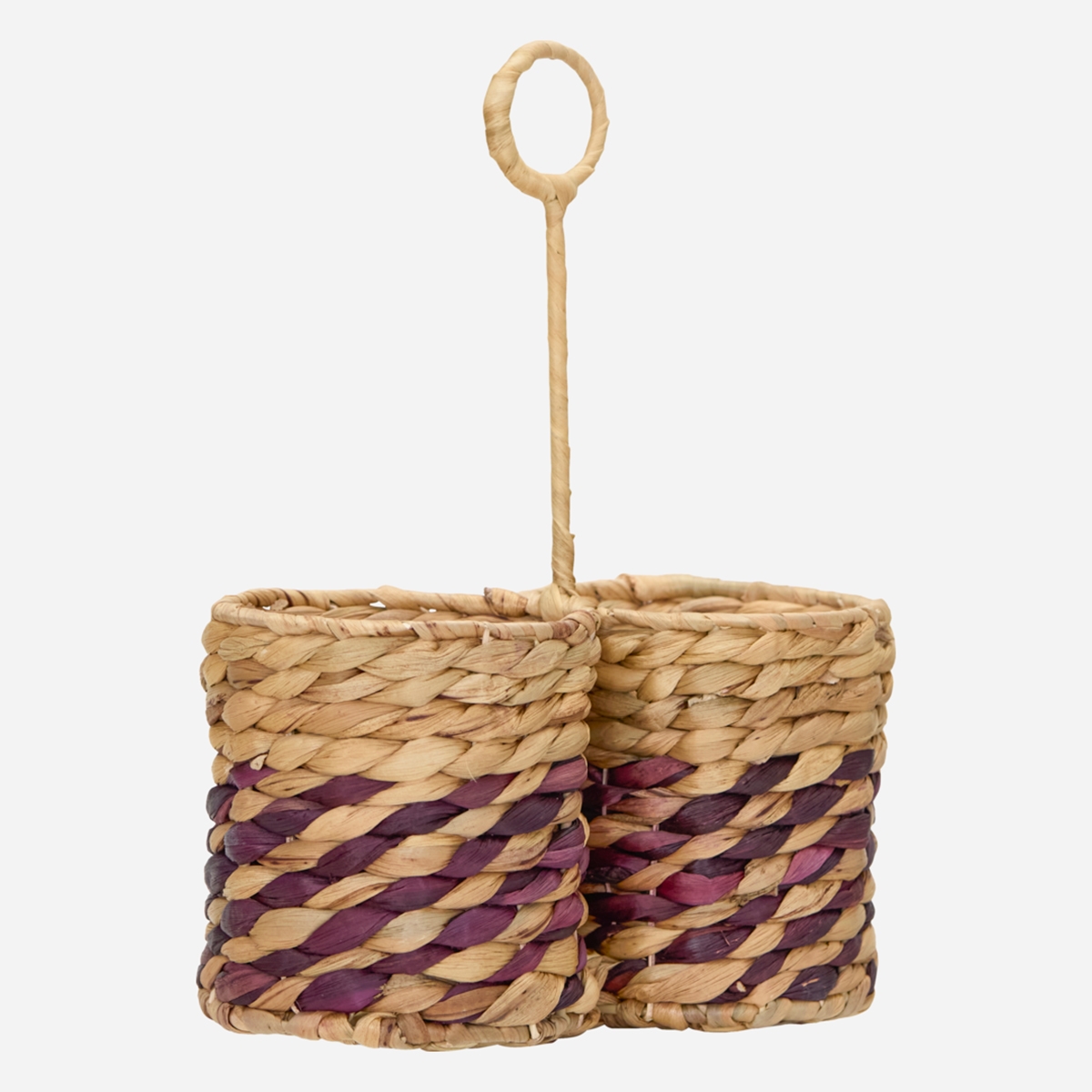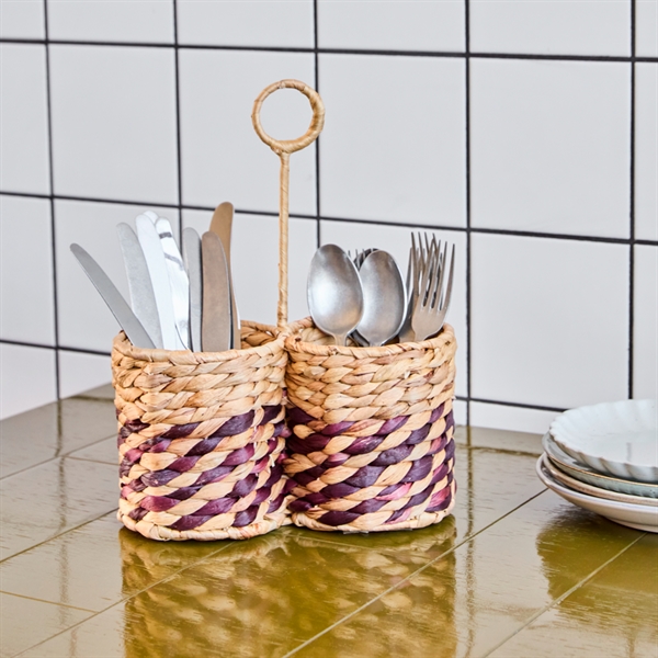 Holderen er flettet i vandhyacint i dets naturlige farve + en stribe i en der er indfarvet i en aubergine nuance. Praktisk bestikholder du kan flytte rundt efter behov og den er også stor nok til at du kan bruge den til køkkenredskaber som piskeris osv.