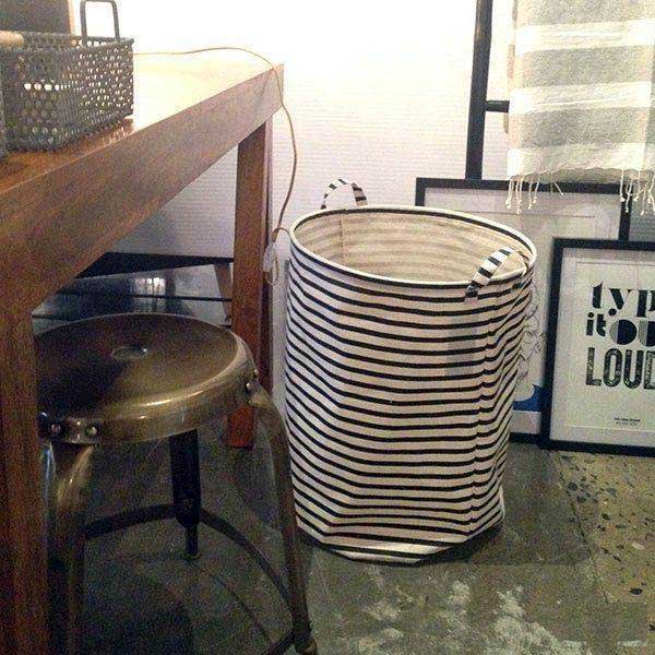 Vasketøjskurv i stof med moderne sorte striber.