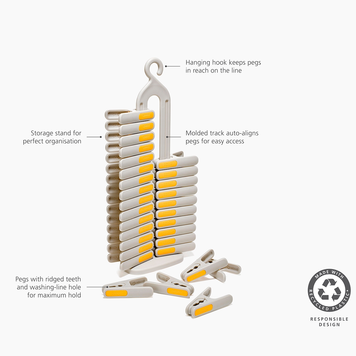 Klemmerne er lavet af 70% genbrugsplast og er lavet i en UV resistent gul nuance. Tøjklemmerne har en rillet kant for optimalt greb.