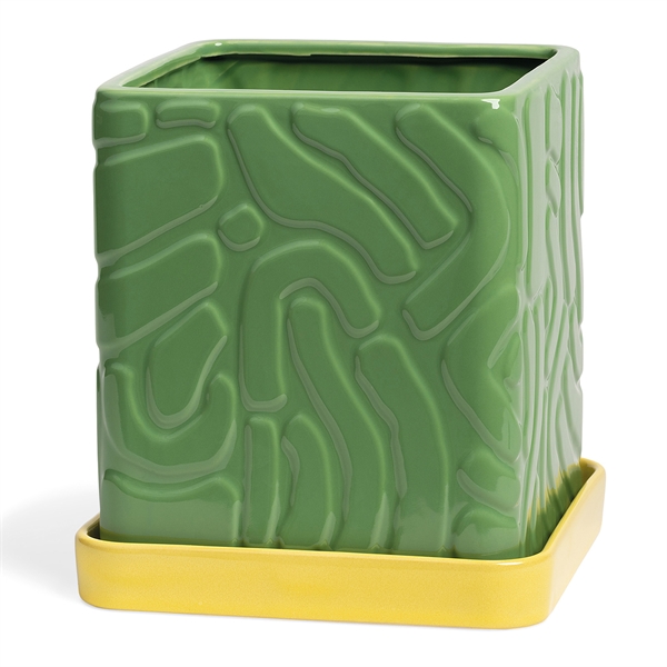 Urtepotteskjuleren Tribe fra Klevering er er lavet i dolomite keramik i en lækker stærk grøn nuance med et flot udskåret mønster og en gul underskål. Tribe krukken har et hul i bunden til dræn af overskydende vand.