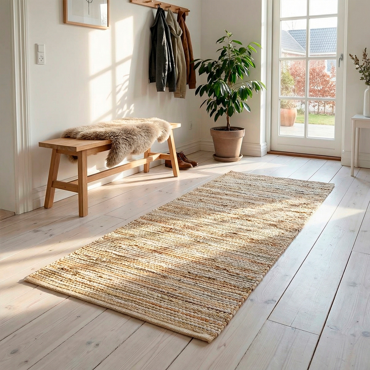 Her køber du tæppet flettet af lyse læderstrimler. Farven er forskellige lyse naturnuancer flettet sammen og afsluttet med en naturfarvet stofkant.
