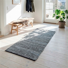 Her køber du tæppet flettet af grå læderstrimler i den lille størrelse - 70x140 cm
