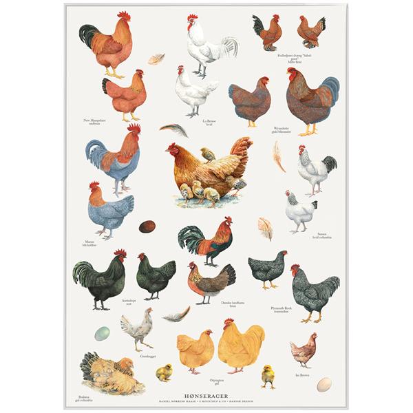 Plakat med illustration de forskellige hønseracer du kan finde i hønsegårde rundt omkring i Danmark.