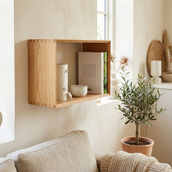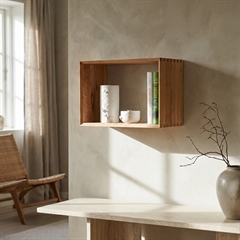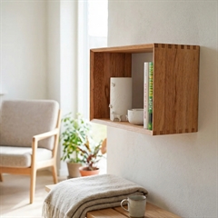 Rektangulær vægkasse til udstilling af pyntegenstande er en hylde i vores egen serie Lake Feel der er lavet i massivt olieret egetræ med tapsamlinger og fasede kanter.