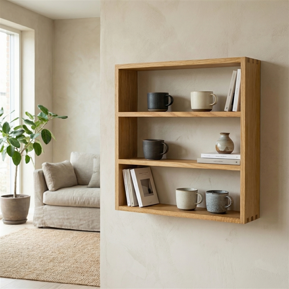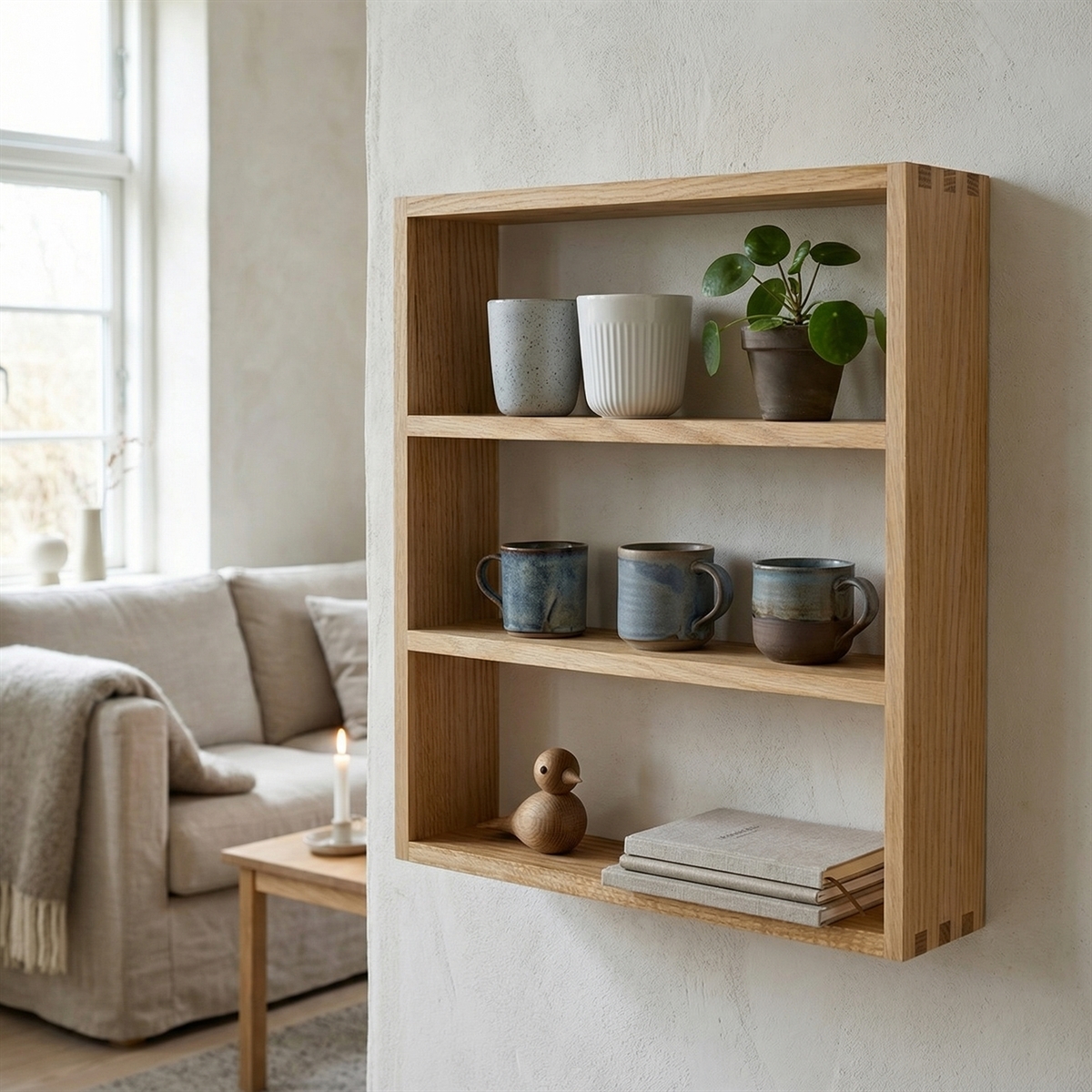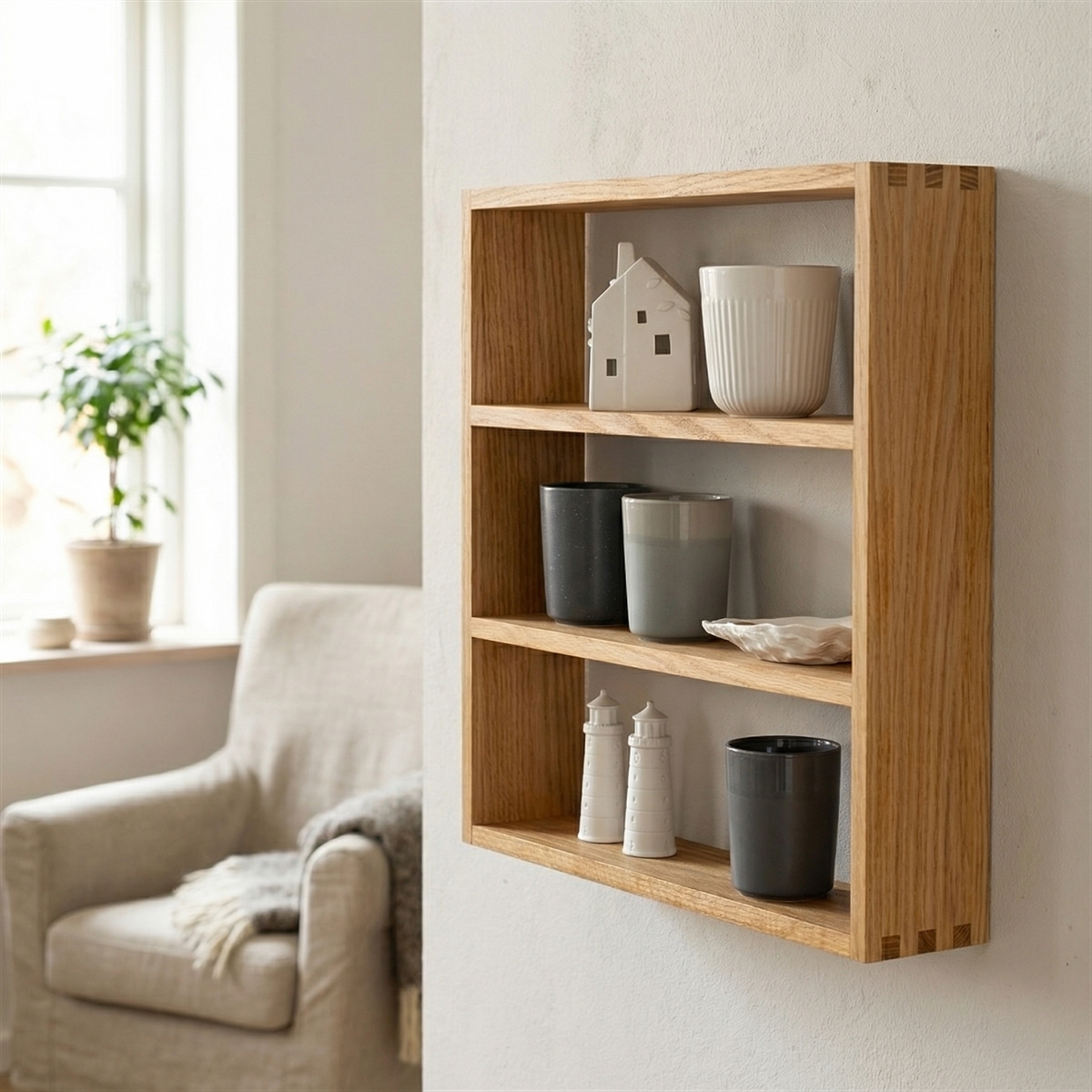 Eksklusiv egetræshylde med 3 rum til dekoration i hjemmet.