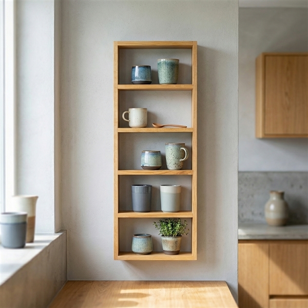 Her finder du Noon hylden med 5 hylder til opbevaring og udstilling af dine favorit kopper, skåle og køkkentilbehør.