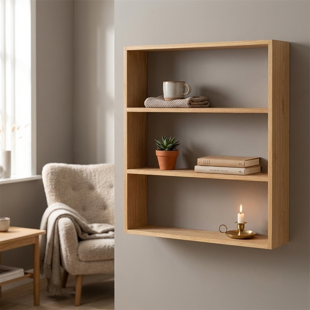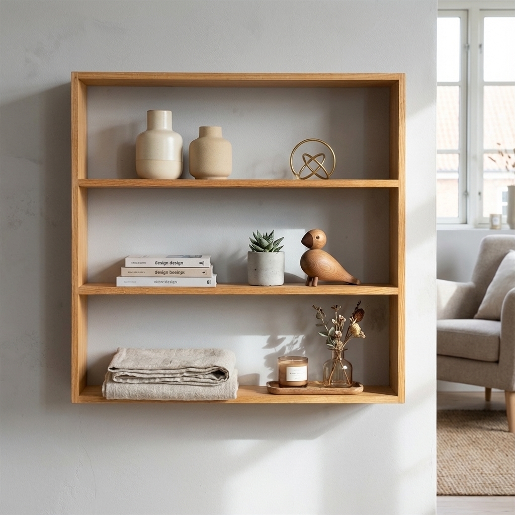 Eksklusiv egetræshylde med 3 rum til dekoration i hjemmet.