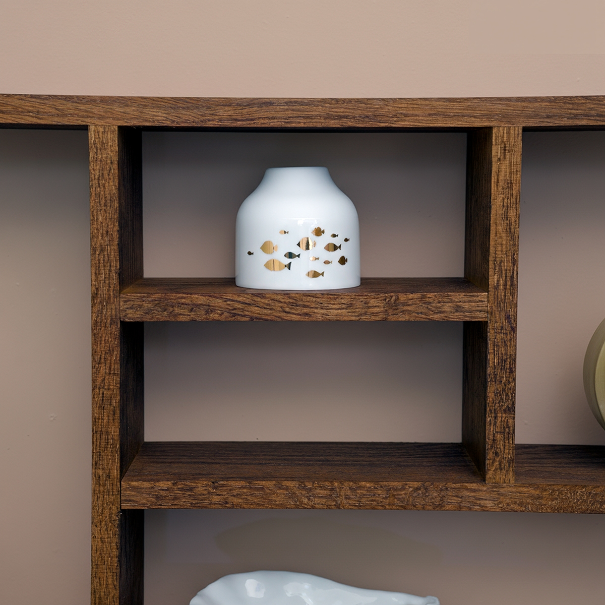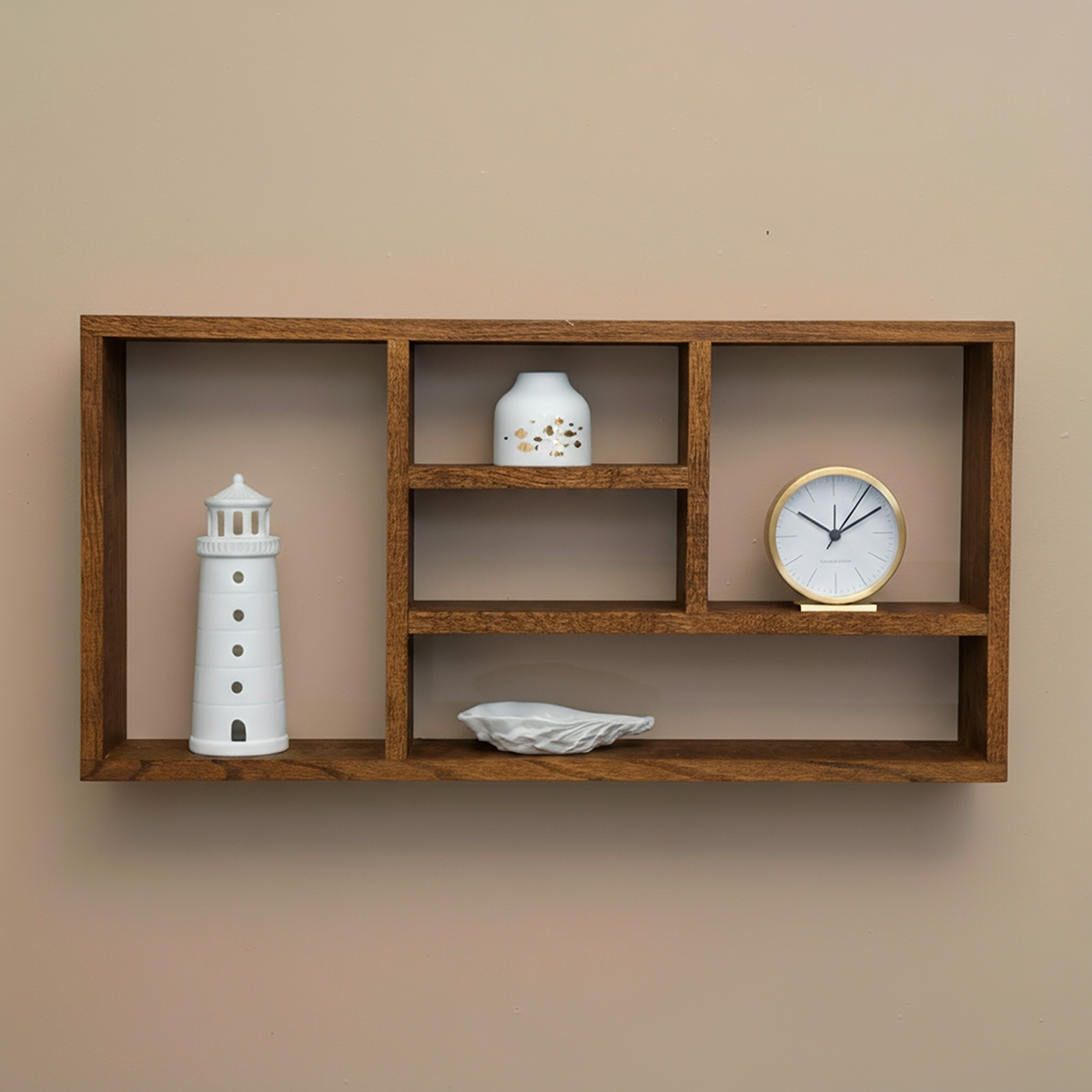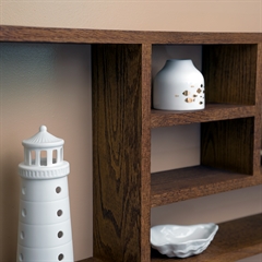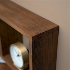 Lake Sættekasse med rum i forskellig størrelse i en mørk olieret nuance. Lake SeeMe sættekassen er, som resten af Lake serien, lavet i massiv egetræ med en naturlig oliering der forlænger hyldens levetid. Kan hænge både horisontalt og vertikalt. Hylden kan bruges til udstilling af samlinger, kopper, sten og krystaller, grønne planter, pynteting, parfumer osv.