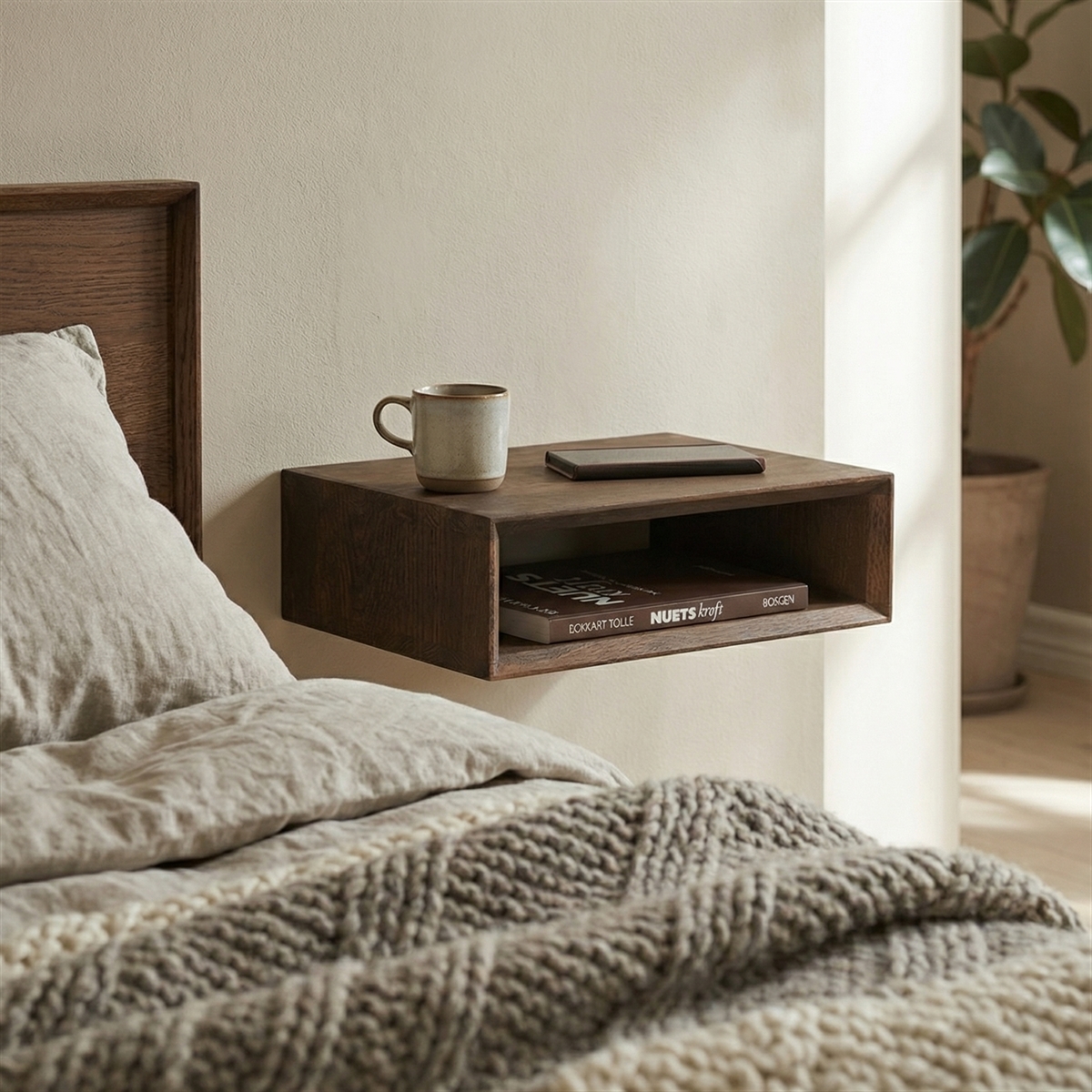 Feel Væghylde/sengebord - En elegant tilføjelse til hjemmet fra LAKE serien i massivt rustikt egetræ. Denne er i den mørkolierede version - Mocha.
