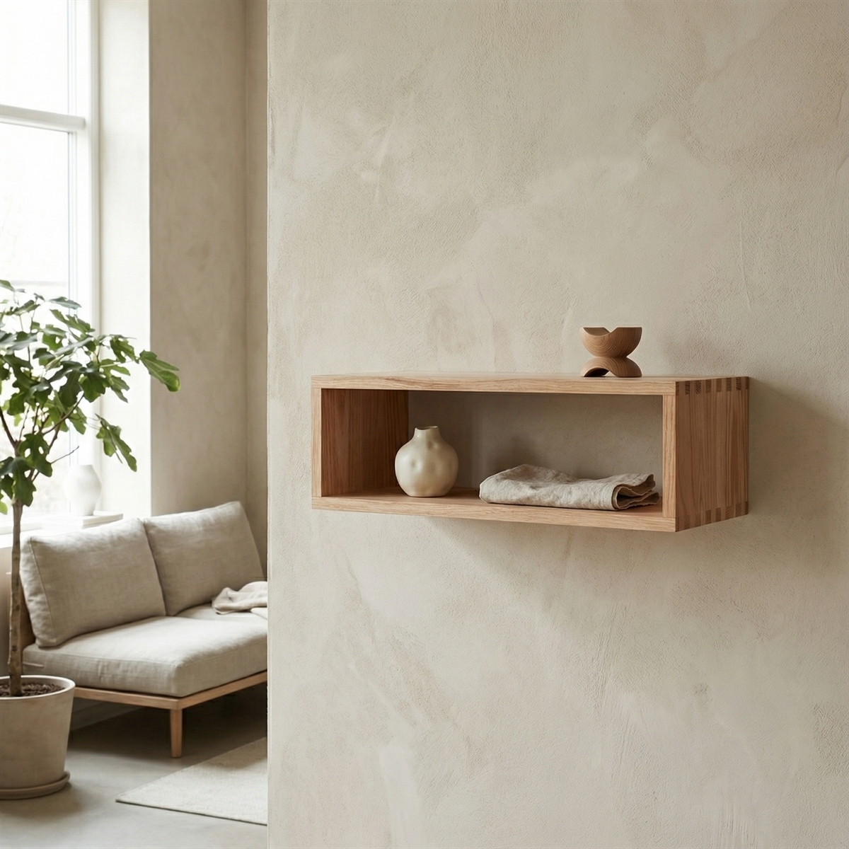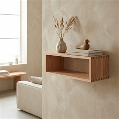 Vægkasse i et smalt aflangt design i vores egen serie Lake, der er lavet i massivt olieret egetræ med tapsamlinger.