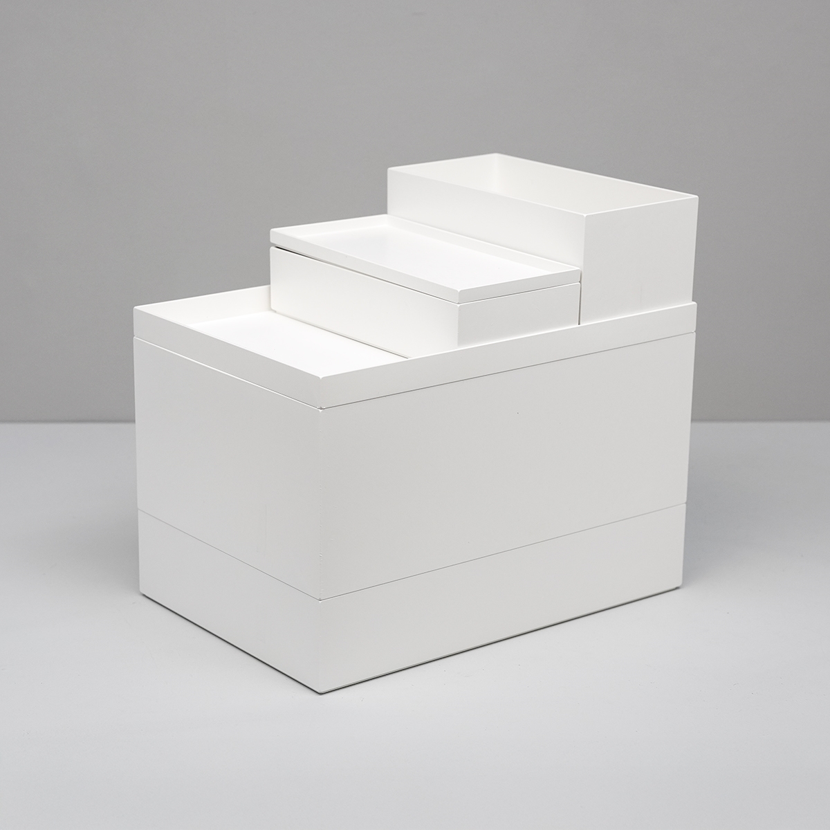Der kan stå tre af de små kasser inden i en af de store eller oven på et låg.