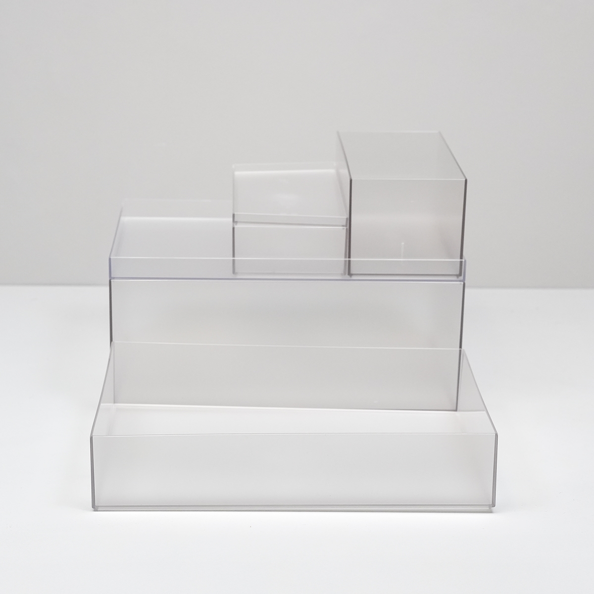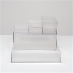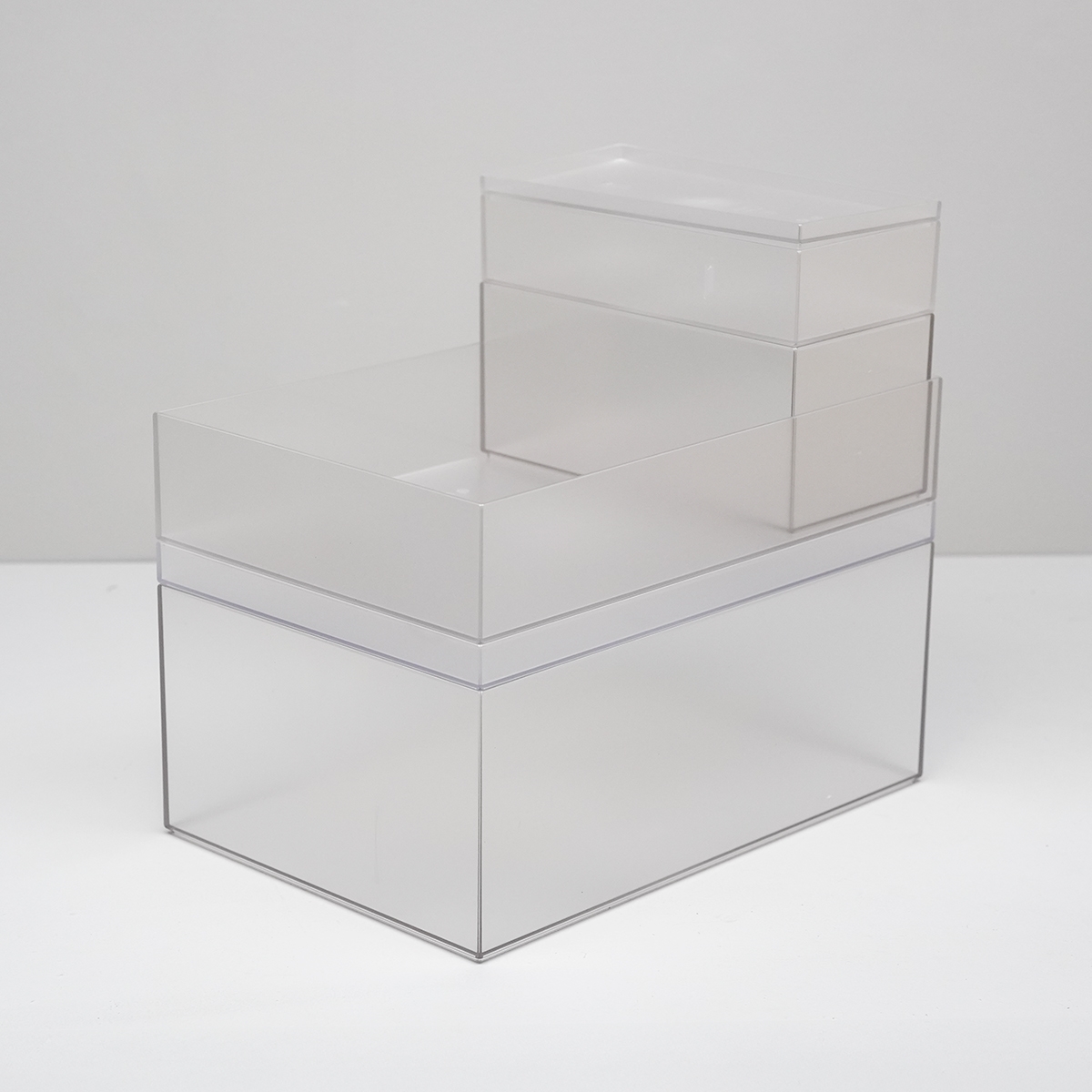 Der kan stå tre af de små kasser inden i en af de store eller oven på et låg.