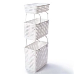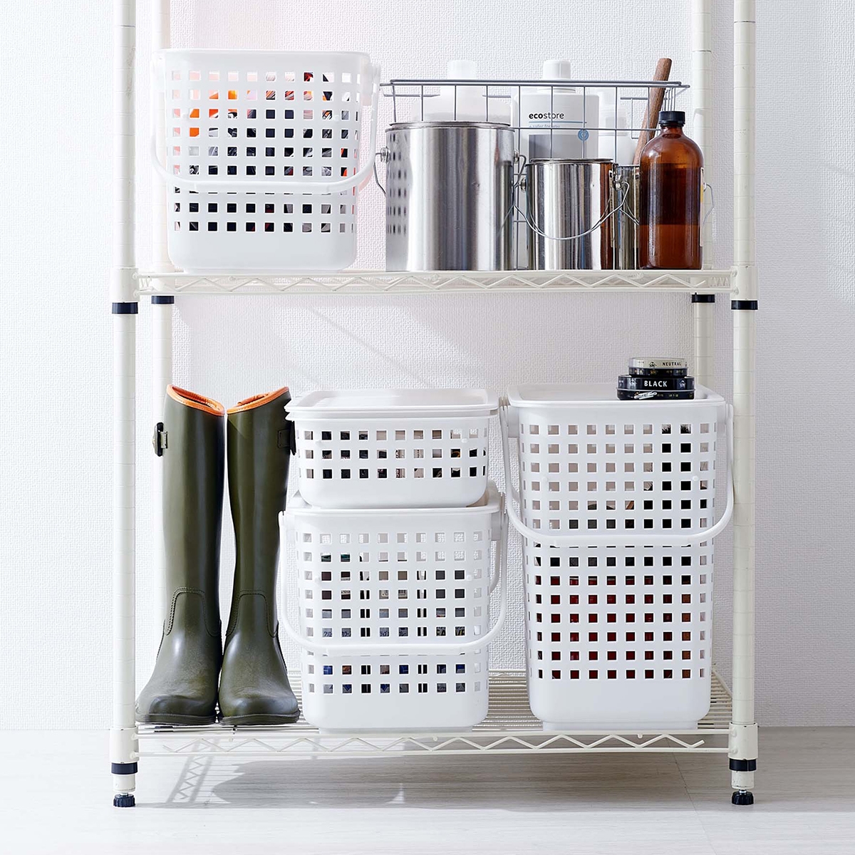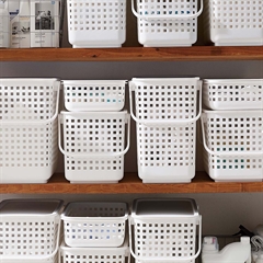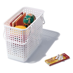 Kurvene kan stables på to måder - enten ved at sætte låg på den nederste, eller ved at sætte håndtagene indad, så kan der stables en ny kurv ovenpå.