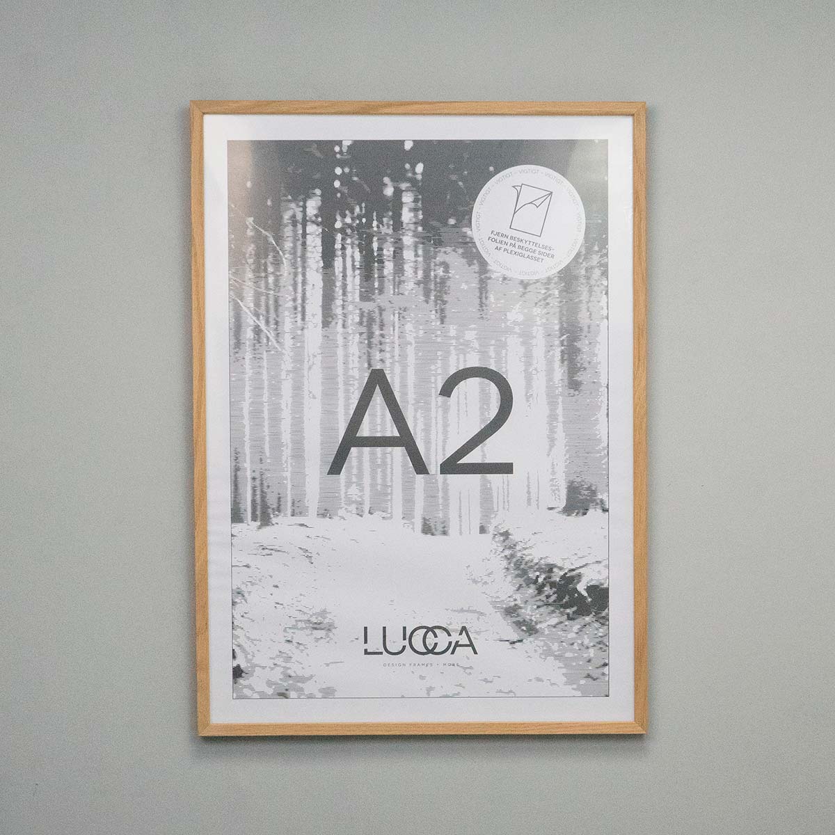 Ramme lavet i egetræ med plexiglasfront, der passer til A2 plakater. (42x59,4 cm.)