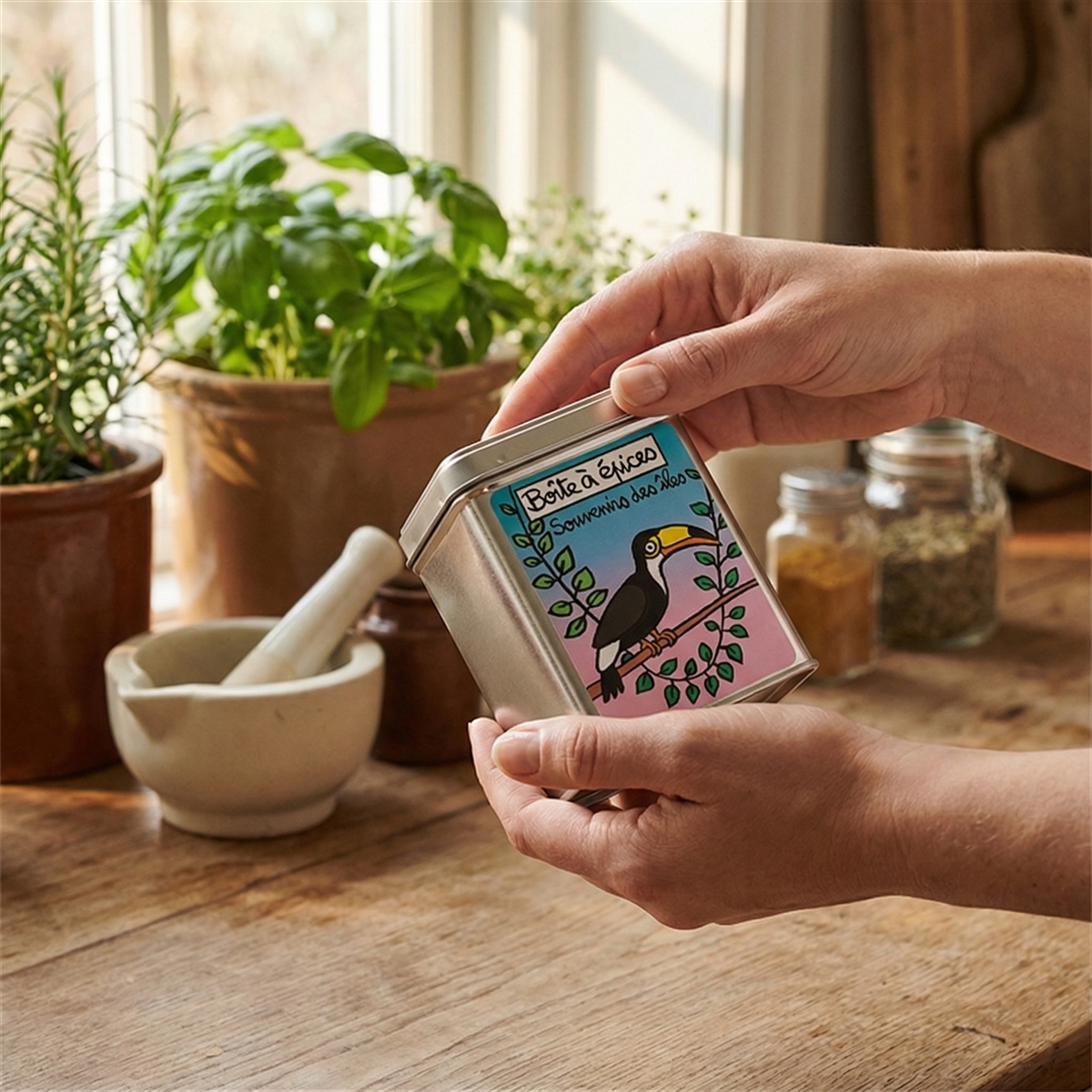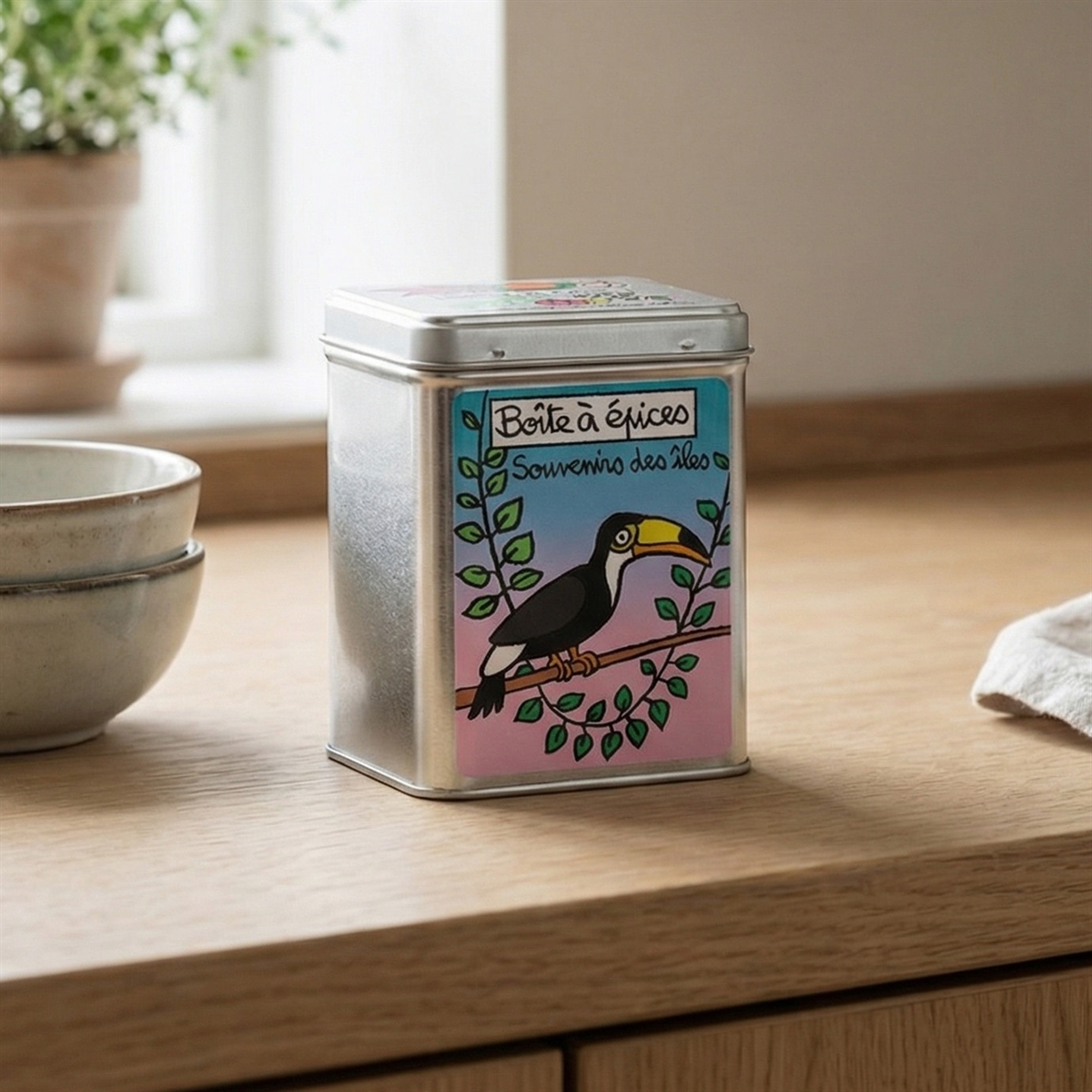 En praktisk og sød lille metaldåse til opbevaring af krydderier i køkkenet. Del af en serie hvor der er lavet dåser til forskellige eksotiske krydderier