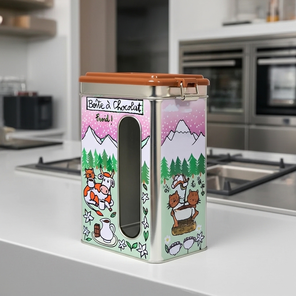 Metaldåse til opbevaring af Kakao, Derrière la Porte