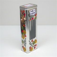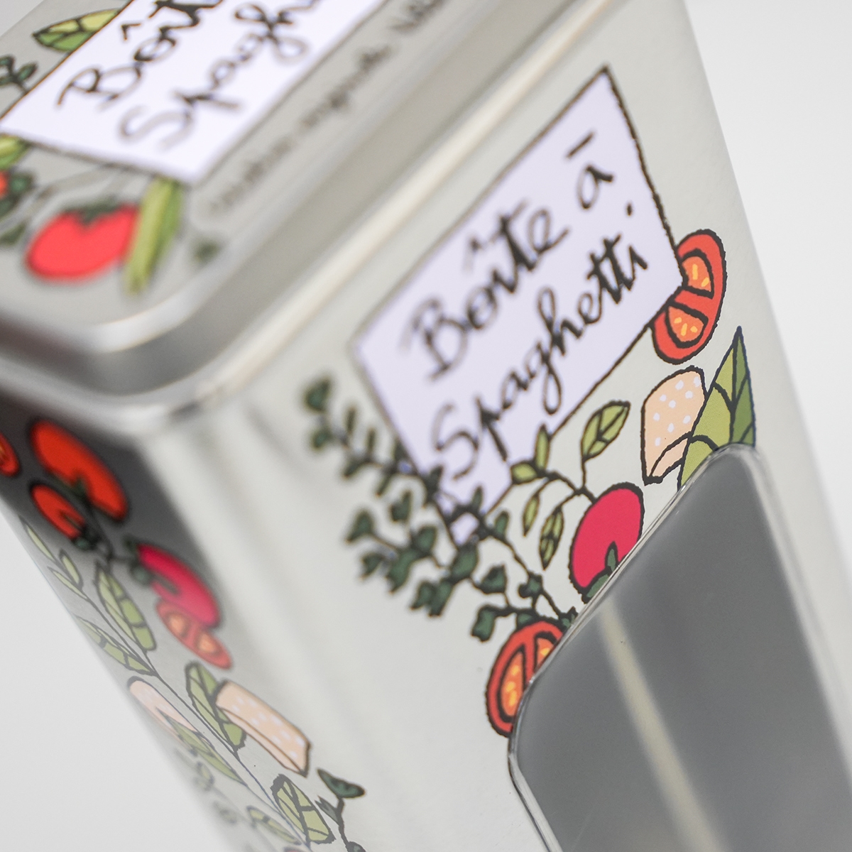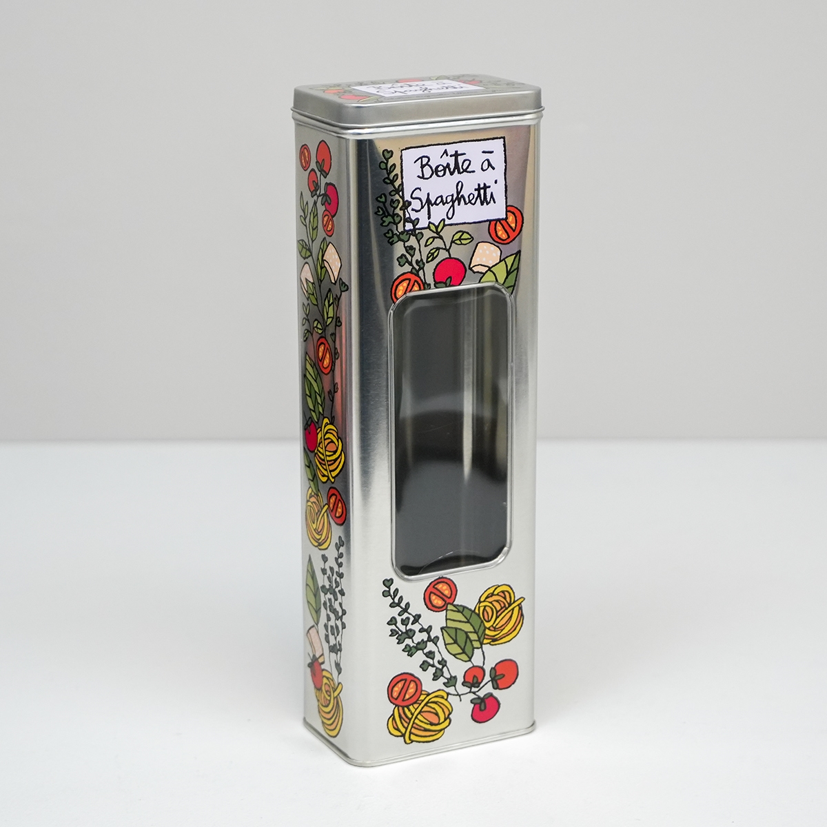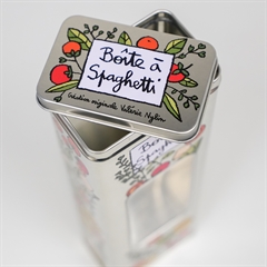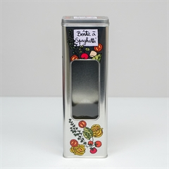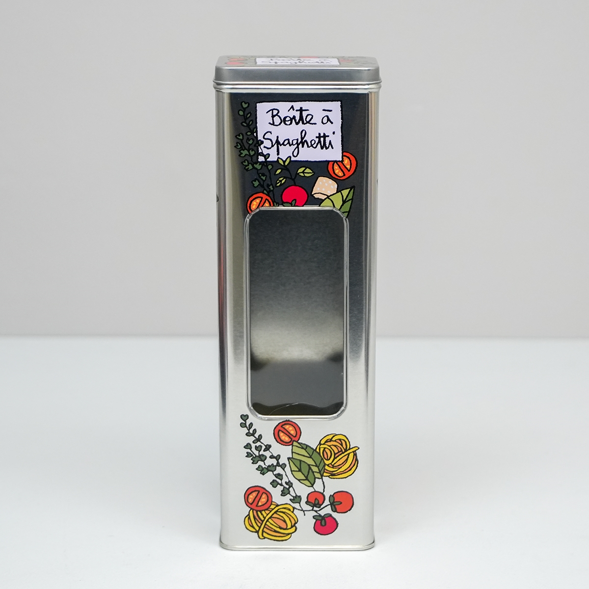 Metaldåse du kan bruge til opbevaring af dit spaghetti. Firkantet metaldåse med låg fra Franske Derrière la Porte. Der er kighul på midten, så du kan se hvor meget indhold der er.