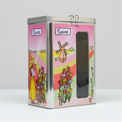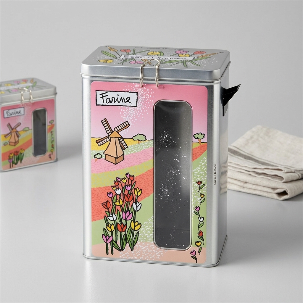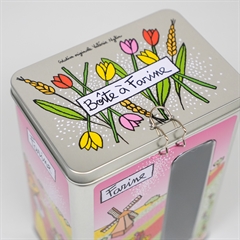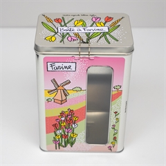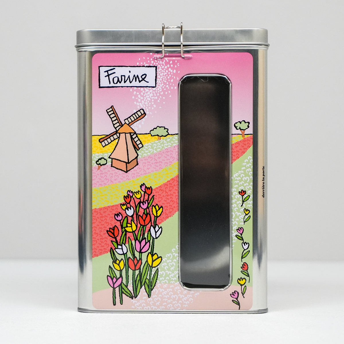 Metaldåse du kan bruge til opbevaring af dit mel fra Derrière la Porte. Denne har et motiv tegnet af Valerie Nylin af tulipaner og vindmøller. Meldåsen har kighul og hældetud, så du nemt kan hælde det ud, uden at åbne låget.