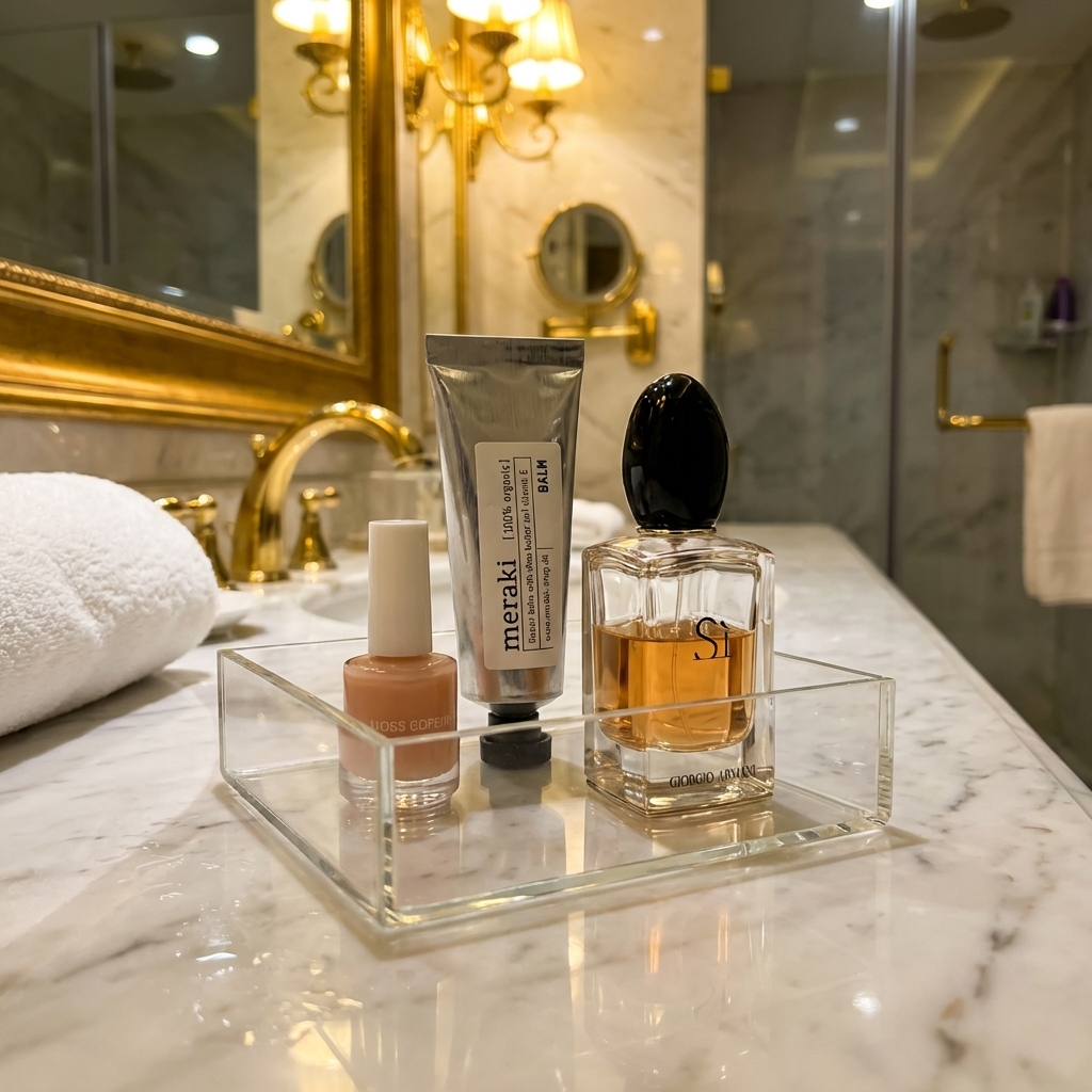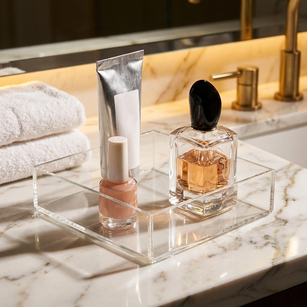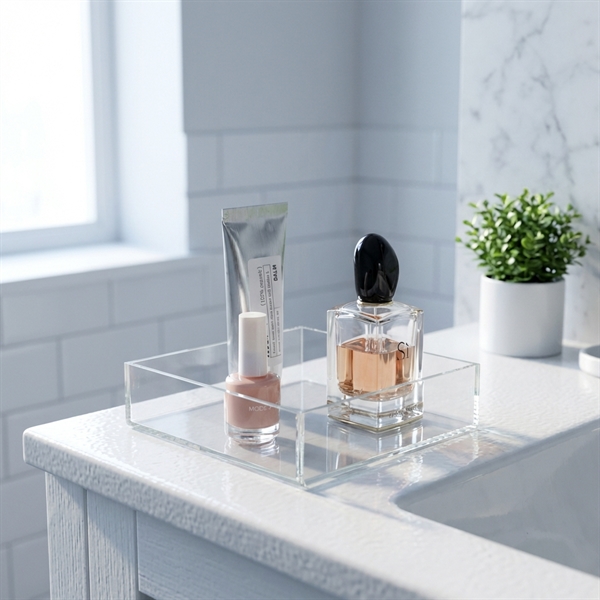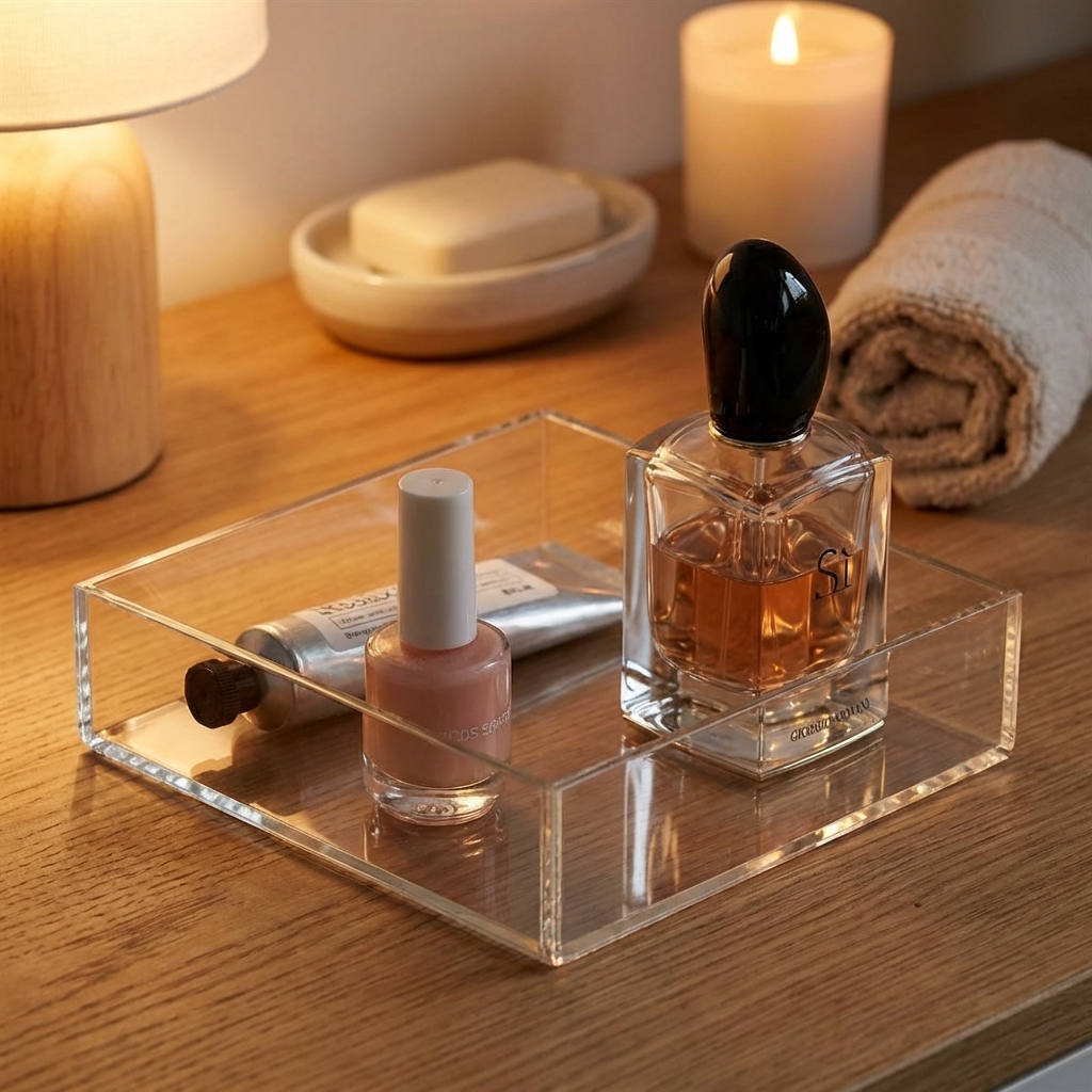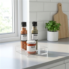 Small akrylbakke i 15x15x4 cm. Del af vores serie af Modena bakker i klar akryl til opbevaring og dekoration.