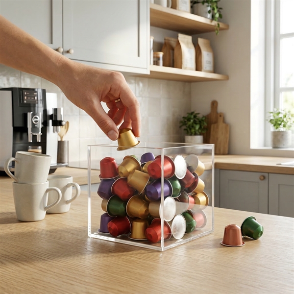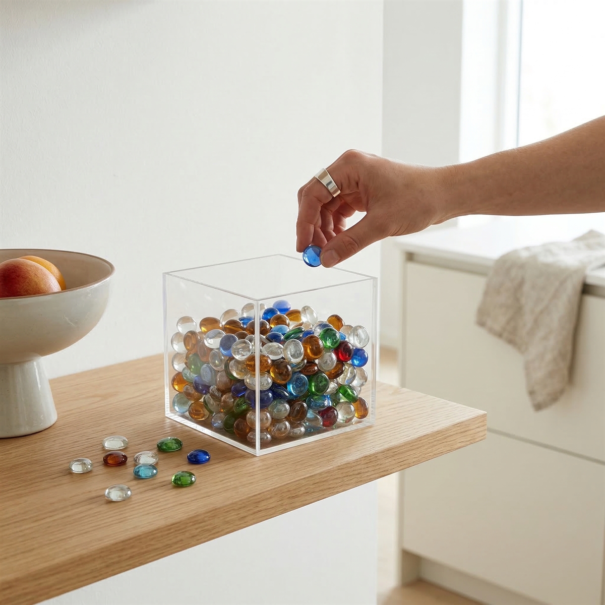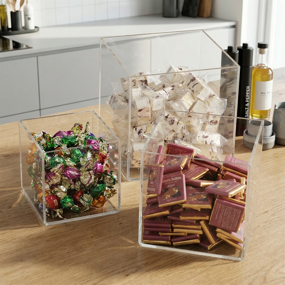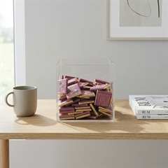Åben kasse lavet i klar akryl til opbevaring og organisering.