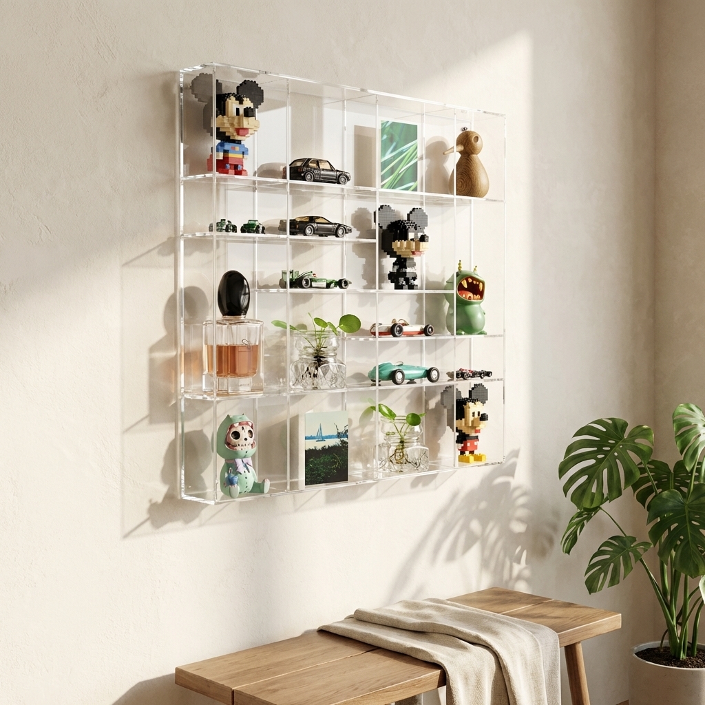 Sættekasse lavet i klar akryl med masser af små rum. Perfekt til at sætte alle de små og finurlige pyntegenstande pænt op i.