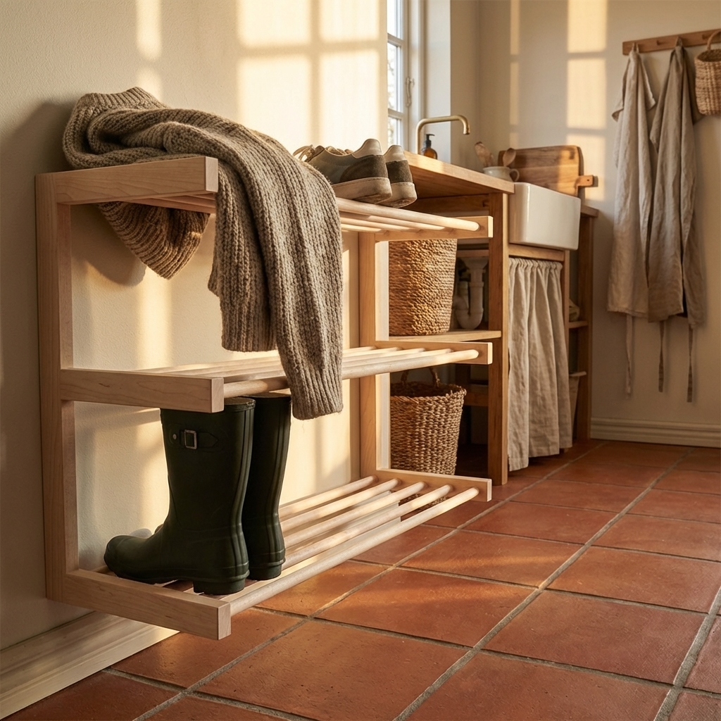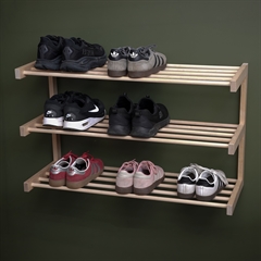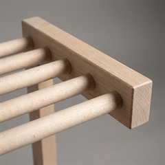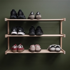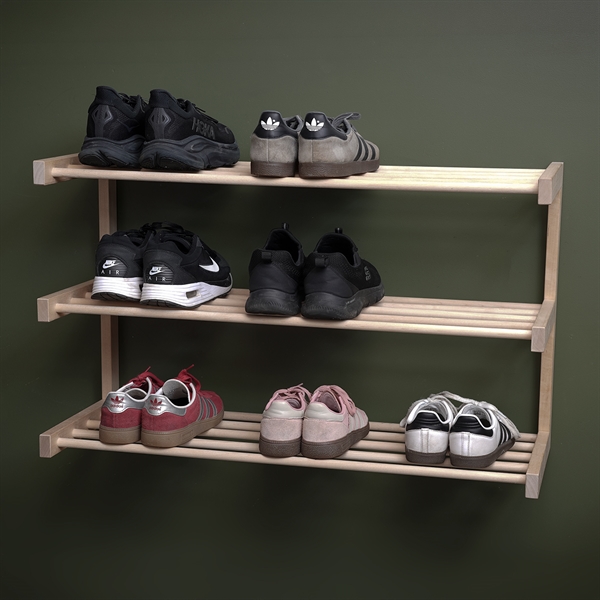 Det lyse birketræ og de bløde runde pinde på skoreolen giver skoreol et varmt nordisk udtryk.