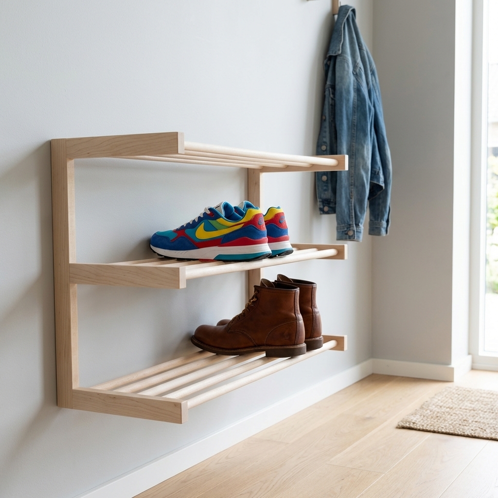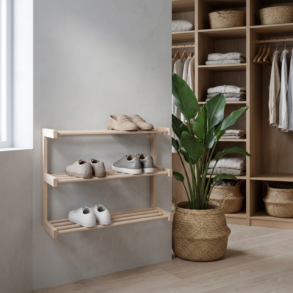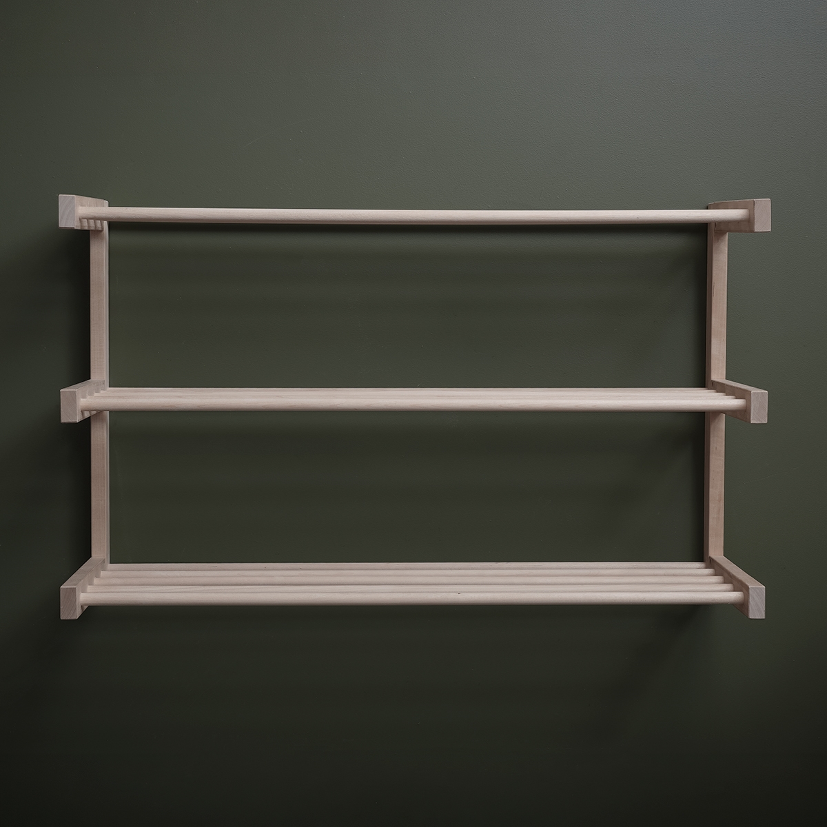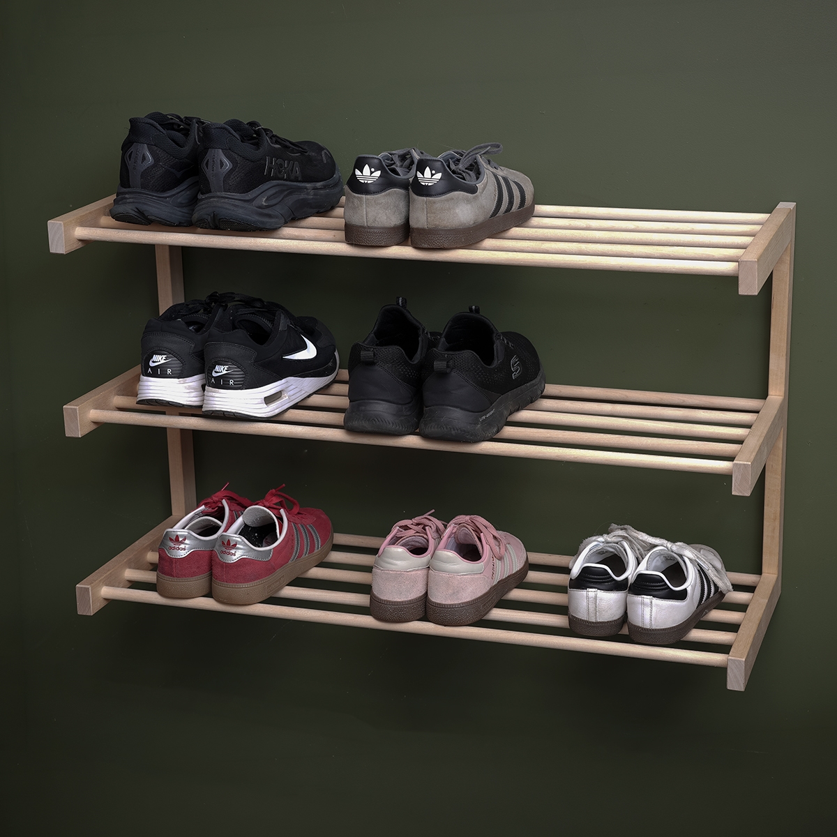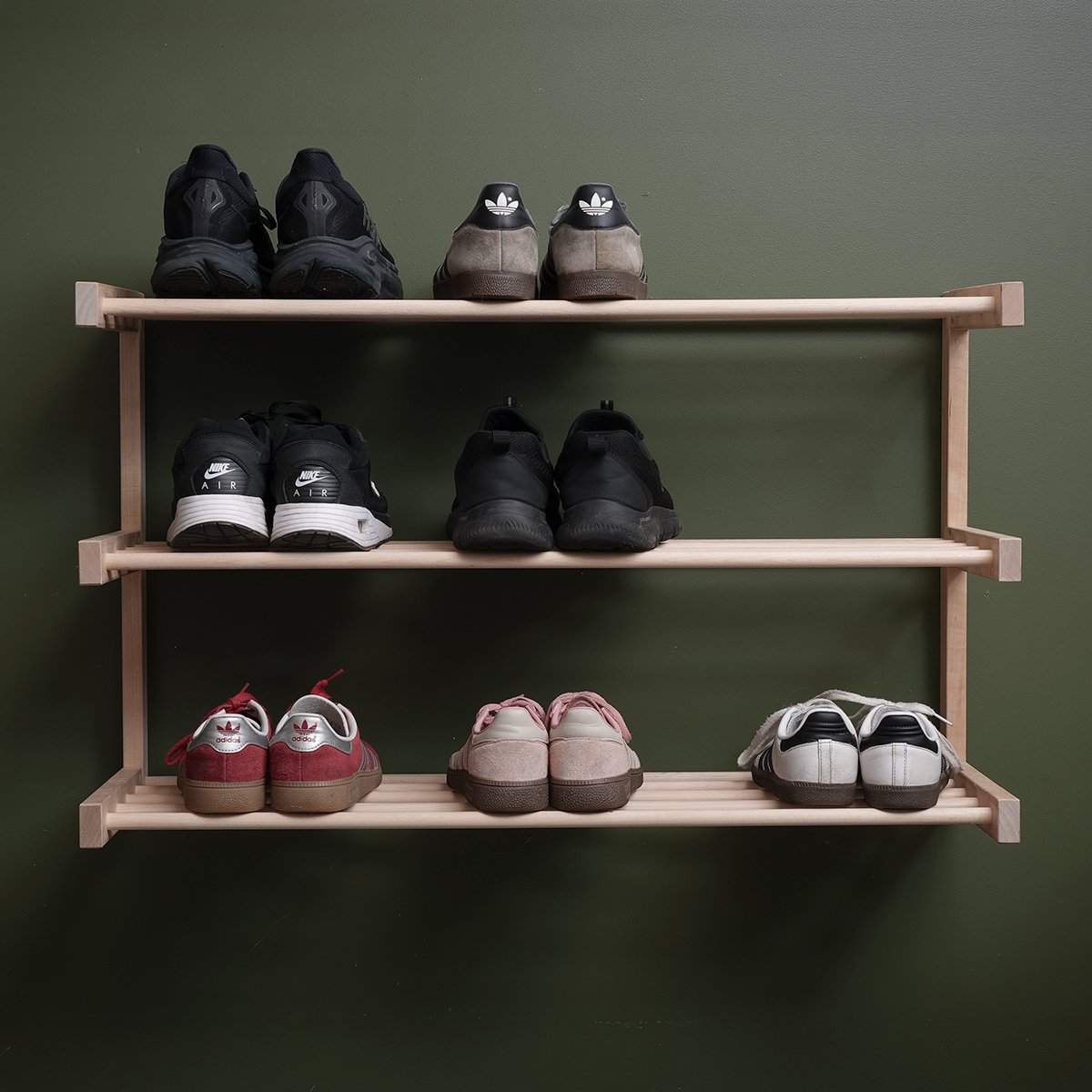 Væghængt skoreol i rent ubehandlet lyst birketræ.