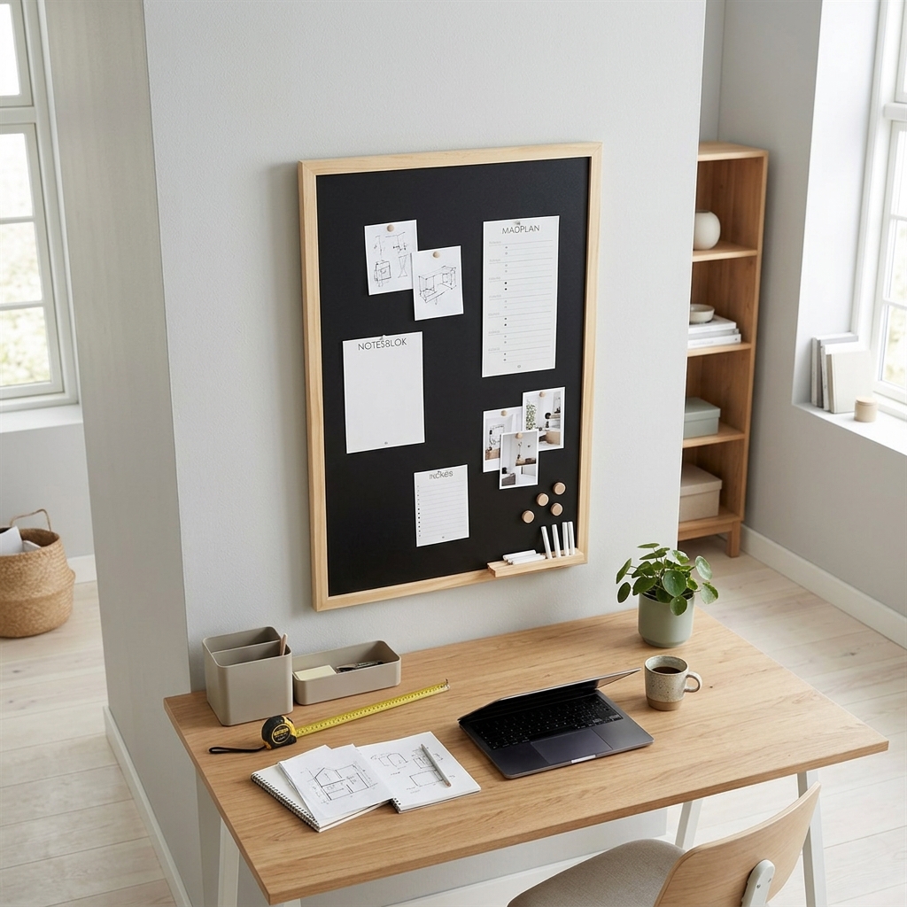 Opslagstavle i metal og fyrretræ. Tavlen kan du skrive på med kridt + den er magnetisk, så du også kan bruge den som opslagstavle.