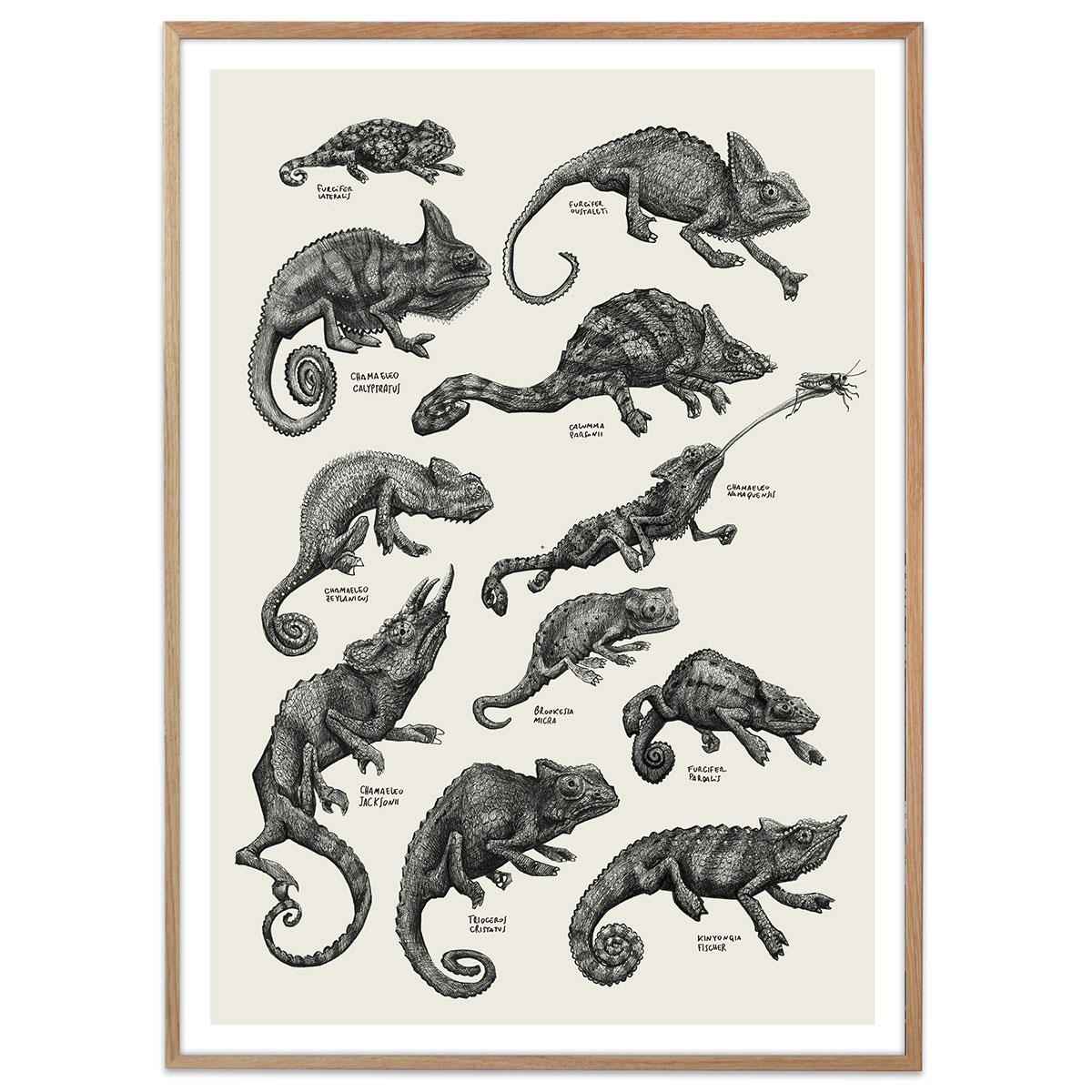Plakaten er lavet med kamæleoner håndtaget med blyant. Ud for hver kamæleon kan du se hvad det er for en art. En både lærerig og dekorativ plakat.