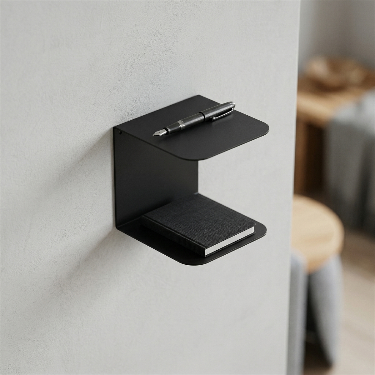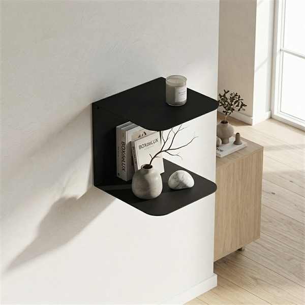 Sector hylde i mat sort metal med 2 hylder til vægophæng.