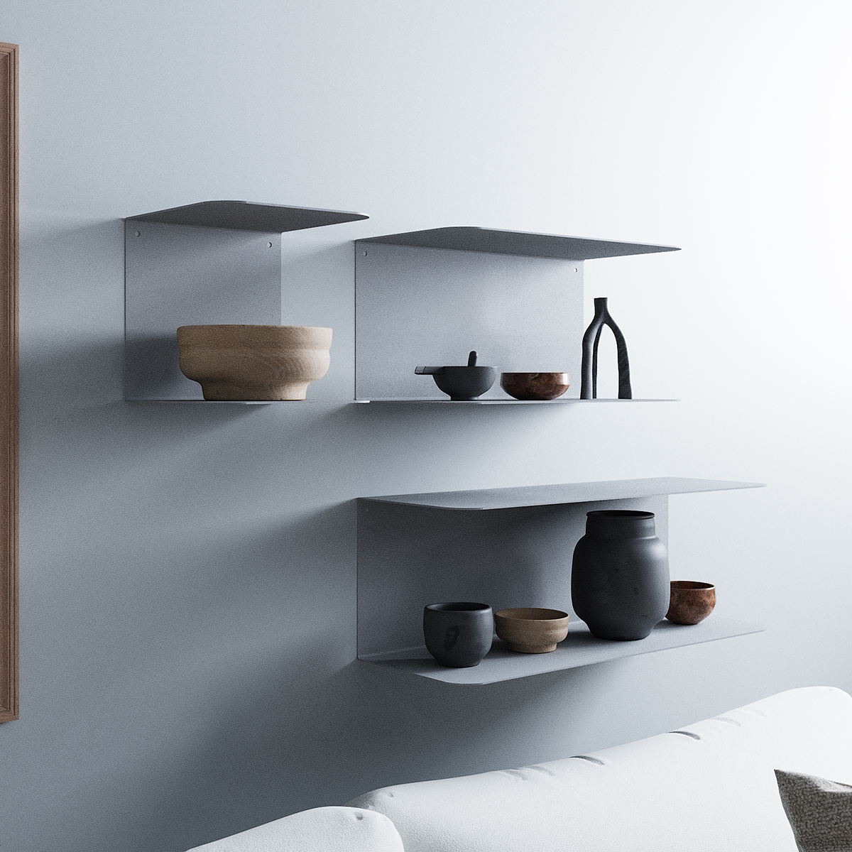 Sector dobbelthylde i mat grå metal med 2 hylder til vægophæng.