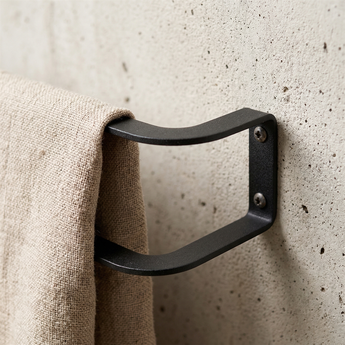 Håndklædeholder i stål i en kraftig kvalitet til montering på væg på badeværelset. Holderen har to arme til håndklæder og er i pulverlakeret stål i en sort nuance. Håndklædeholderen er fra vores egen serie Sector, som er fremstillet i Danmark.