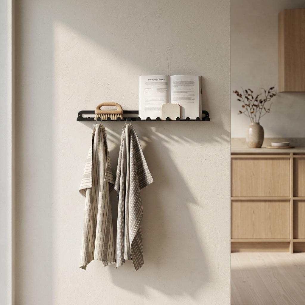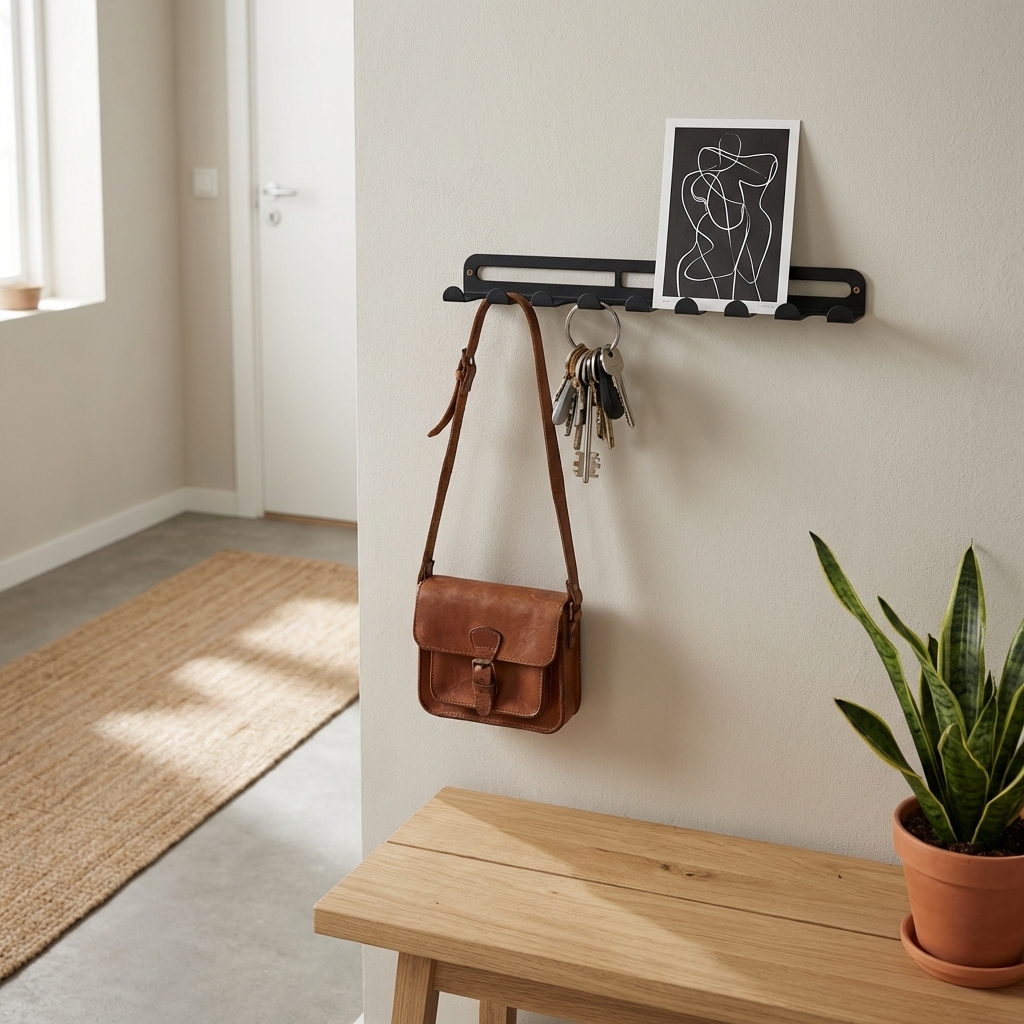 Du kan bruge knagerækken til tasker og tøj eller du kan bruge den til hængende smykker eller viskestykker i køkkenet. Der er også plads til at stille et par billeder på knagerækken.