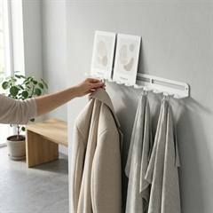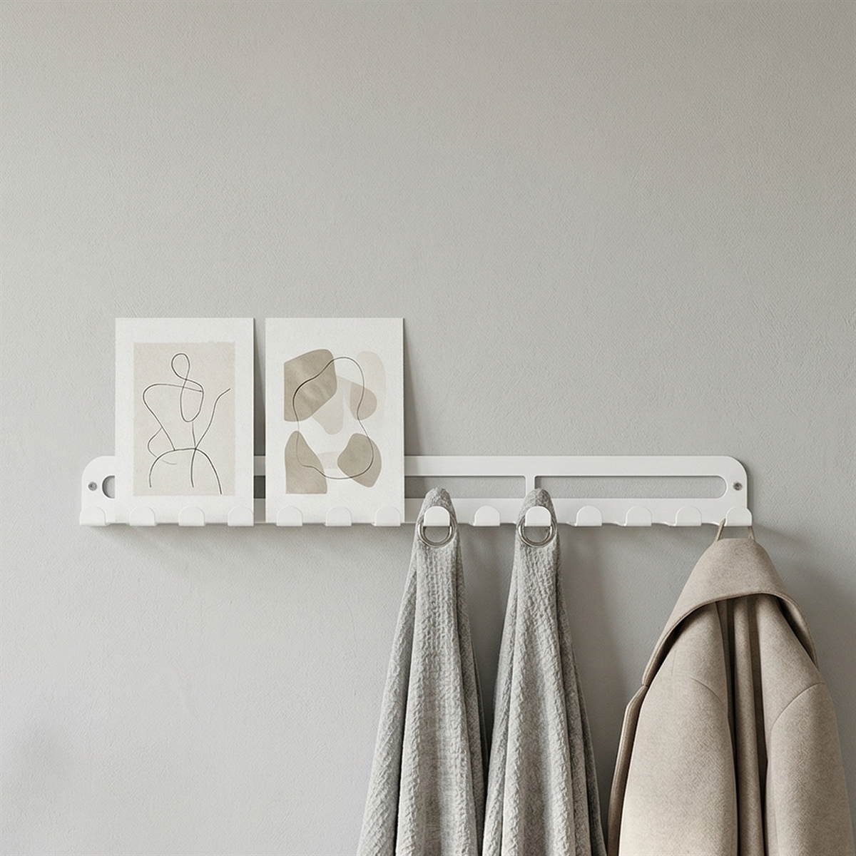 Stilren smal knagerække i mat hvid metal - 40 cm. bred. Du kan bruge knagerækken til tasker og tøj, eller du kan bruge den til hængende smykker eller viskestykker i køkkenet. Der er også plads til at stille et par billeder på knagerækken.