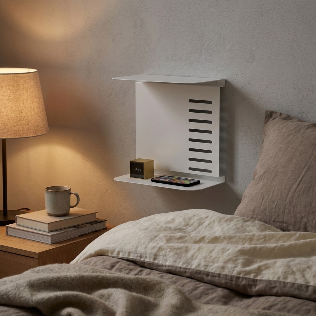 Nagano natbord i metal til at hænge på væggen ved siden af sengen. Lækkert design med afrundede hjørner og små detaljer der giver sengebordet et eksklusivt look.