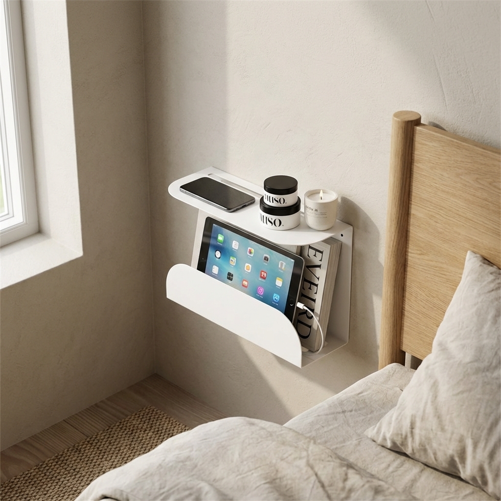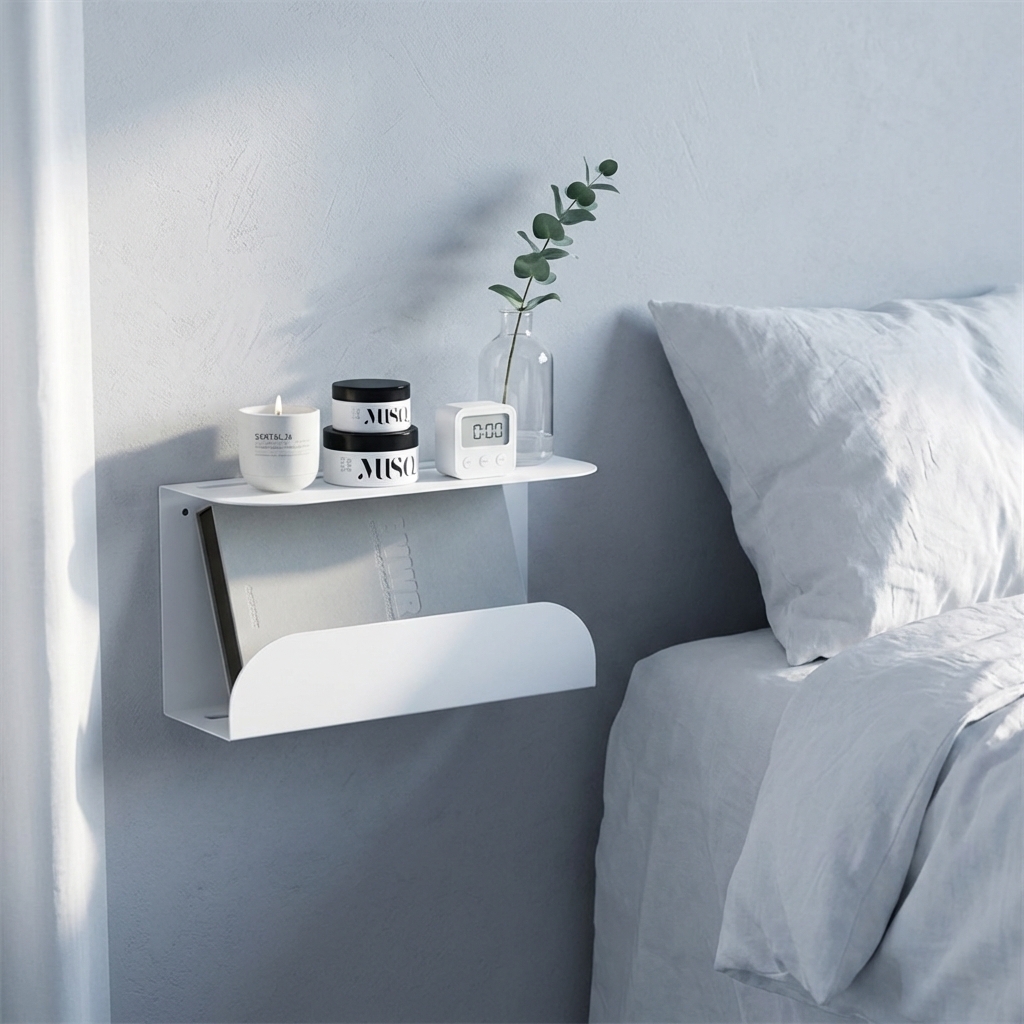 Et stilrent og funktionelt lille natbord i mat hvid metal. Sengebordet er lavet til at hænge på væggen ved siden af sengen.