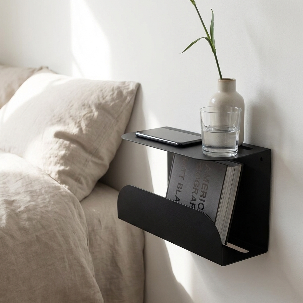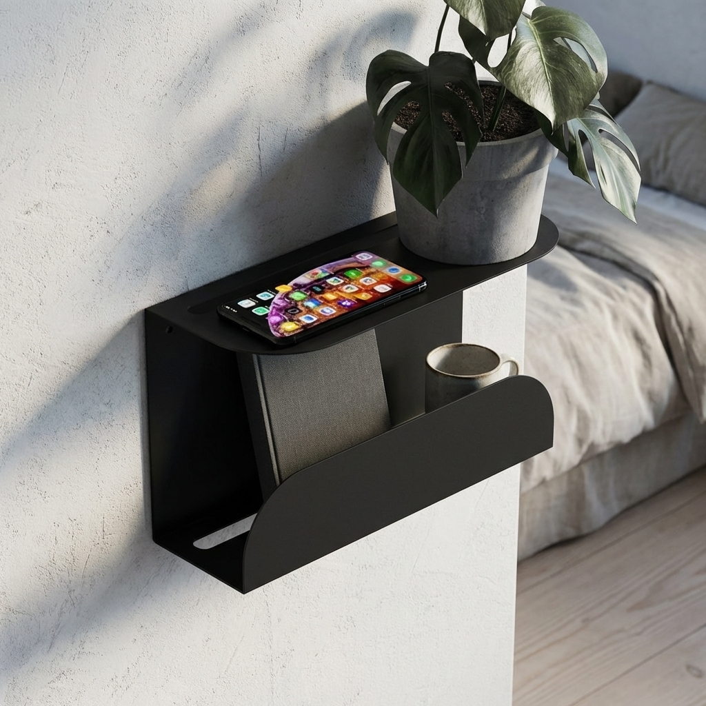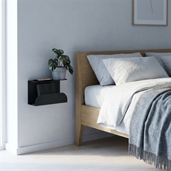 Et stilrent og funktionelt lille natbord i mat sort metal. Sengebordet er lavet til at hænge på væggen ved siden af sengen.