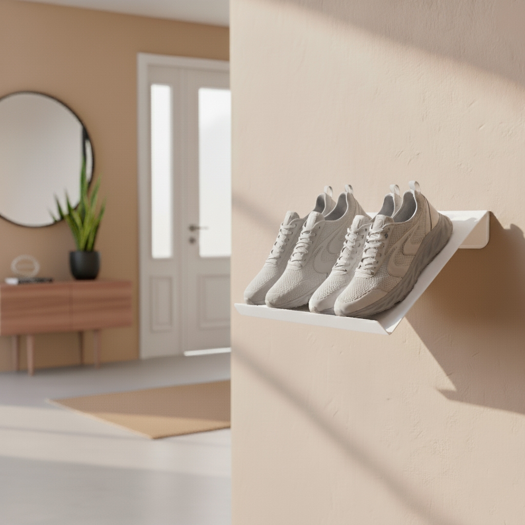 En smart hylde til opbevaring af sko på væggen. Hylden monteres nemt og enkelt på væggen og frigør gulvplads i hjemmet.