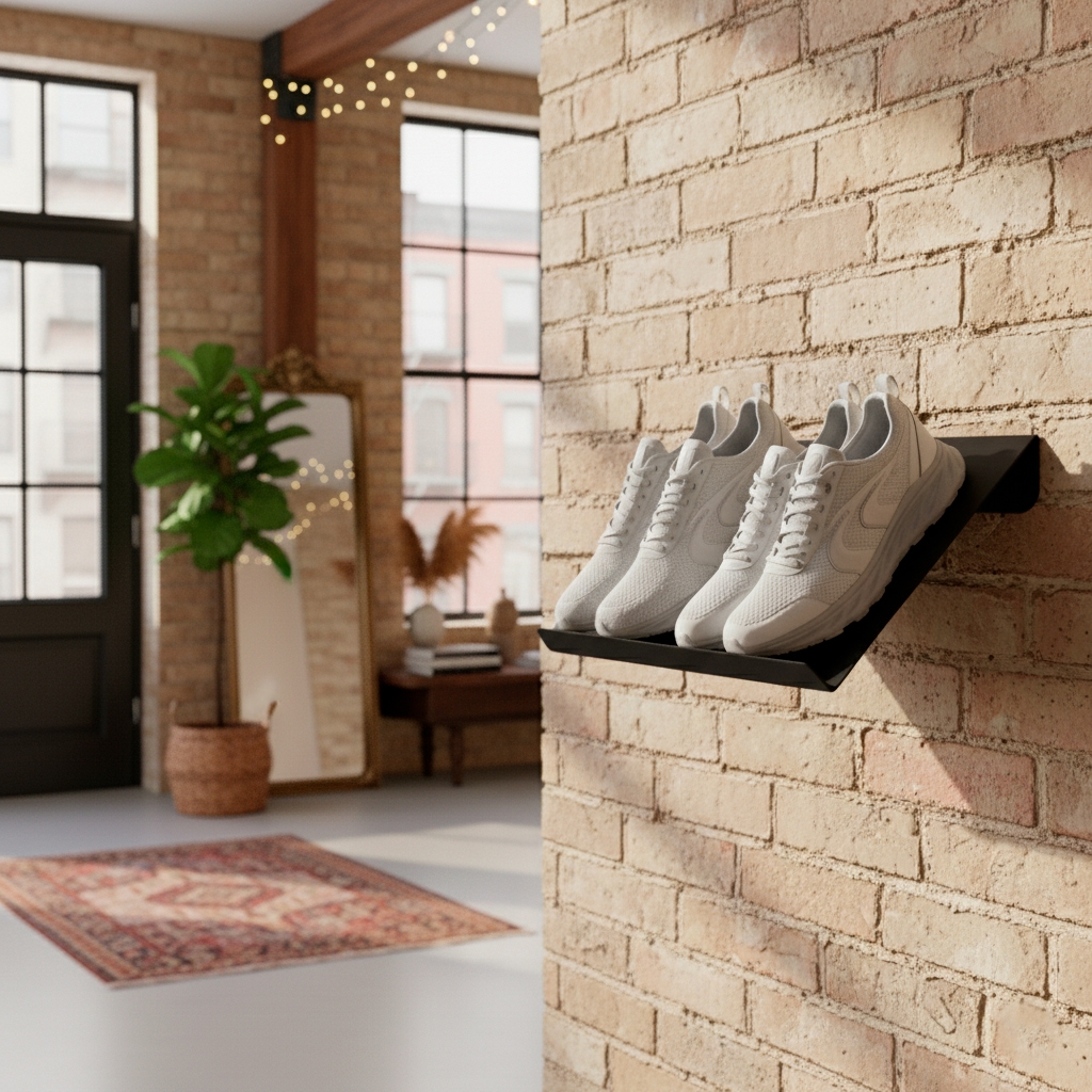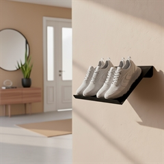 En smart hylde til opbevaring af sko på væggen. Hylden monteres nemt og enkelt på væggen og frigør gulvplads i hjemmet.