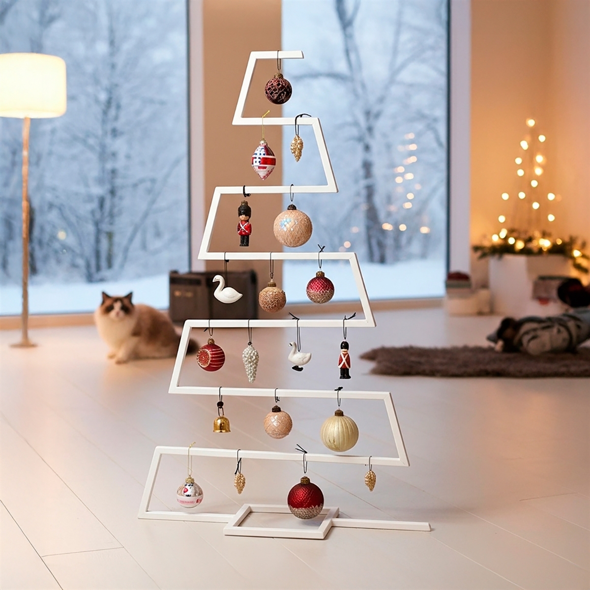 Dekorativt metaltræ til ophæng af julekugler og pynt i den søde juletid.